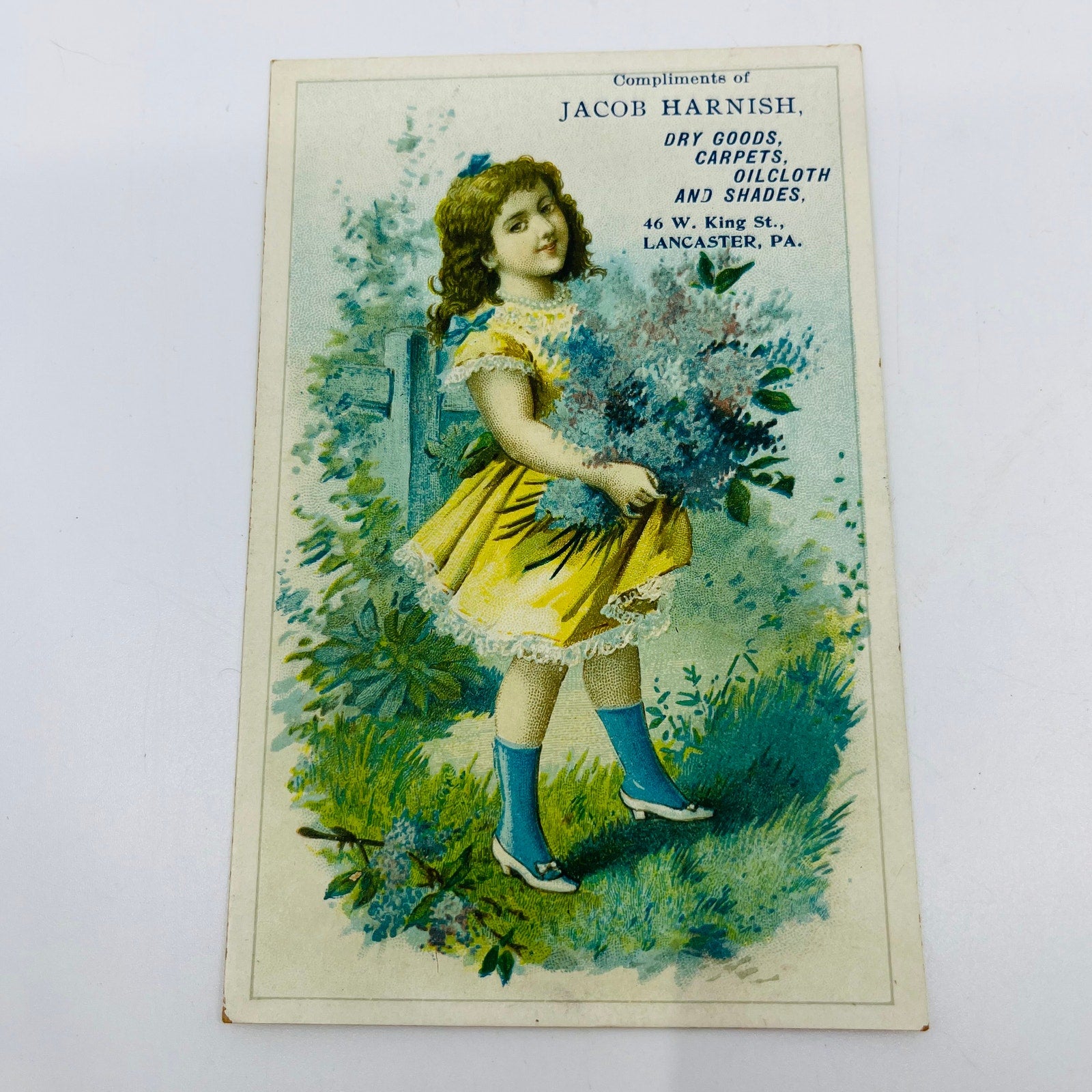 1880s Victorian Trade Card Lancaster PA Jacob Harnish Dry Goods Girl Flowers SAH9-H7