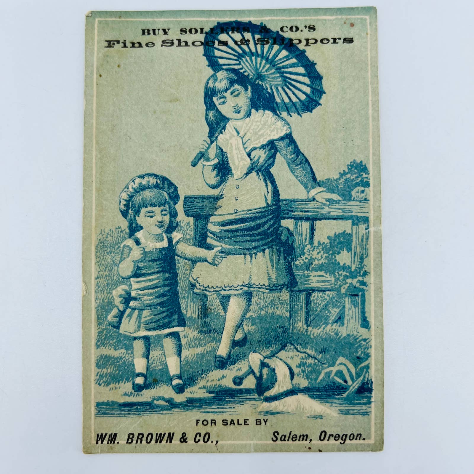 1880s Victorian Trade Card Soller’s & Co Shoes & Slippers WM Brown Salem OR AA2