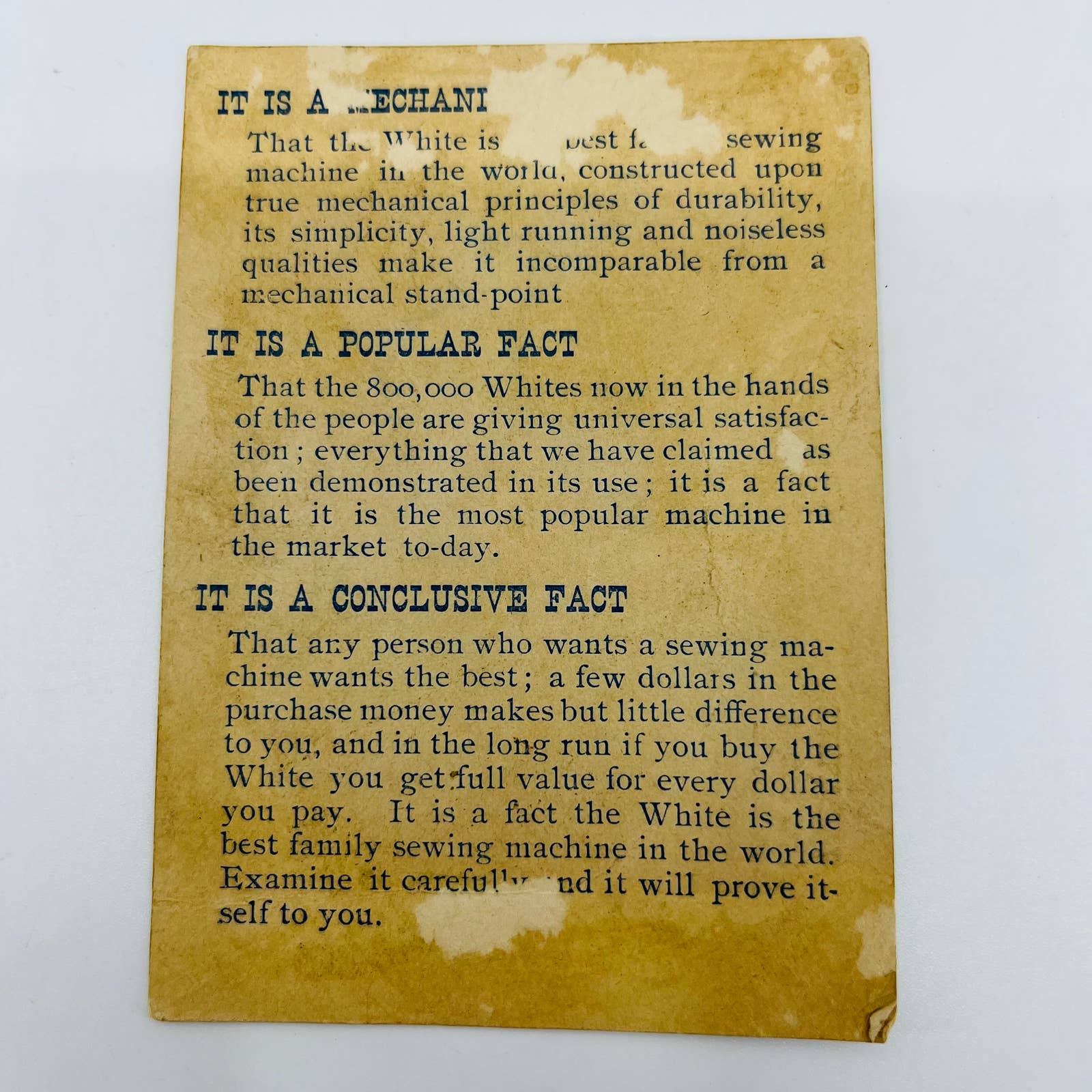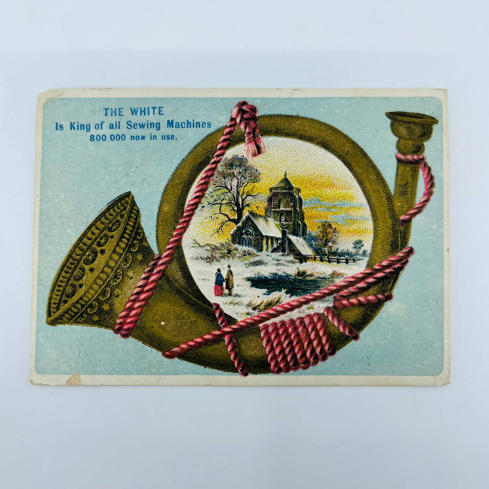 1880s Victorian Trade Card THE WHITE King of All Sewing Machines Horn AA2