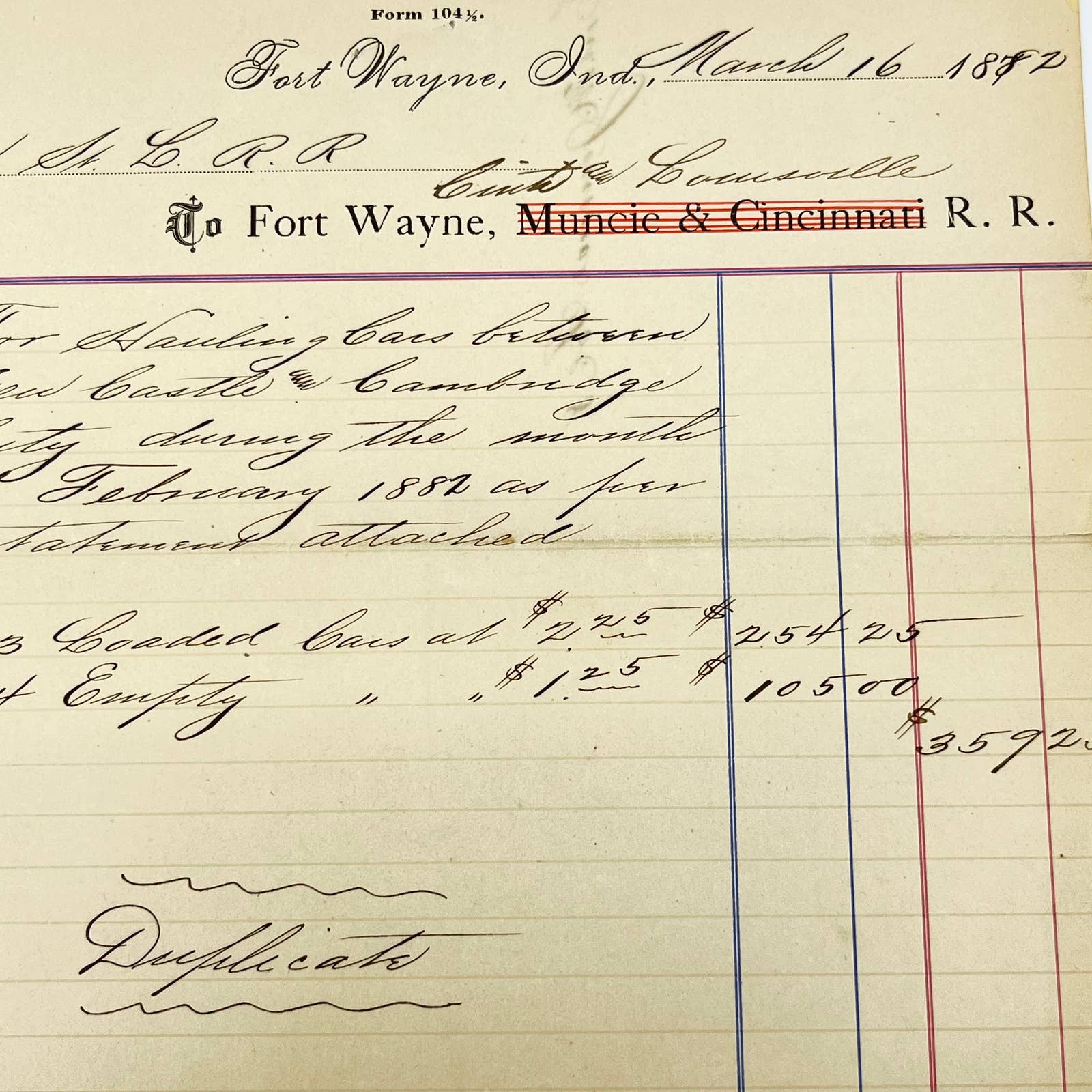 1882 Fort Wayne, Muncie & Cincinnati Railroad RR Letterhead Billhead AB1-1