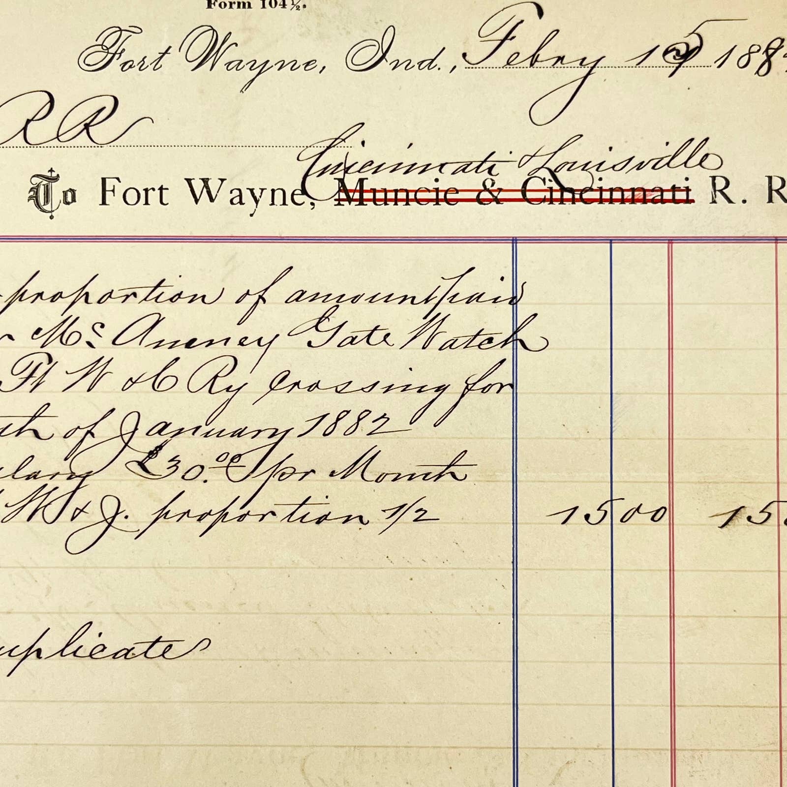 1882 Fort Wayne, Muncie & Cincinnati Railroad RR Letterhead Billhead AB1-5