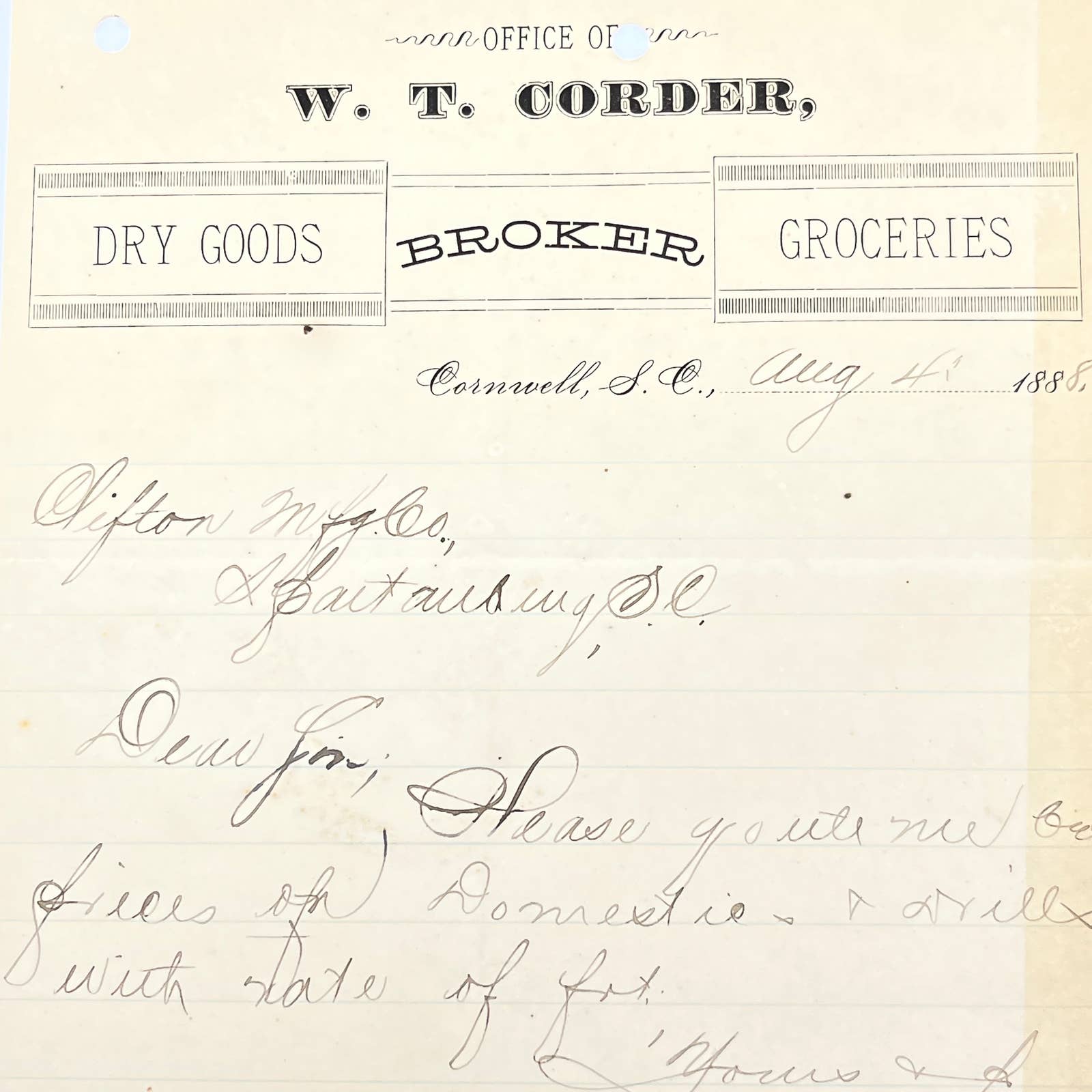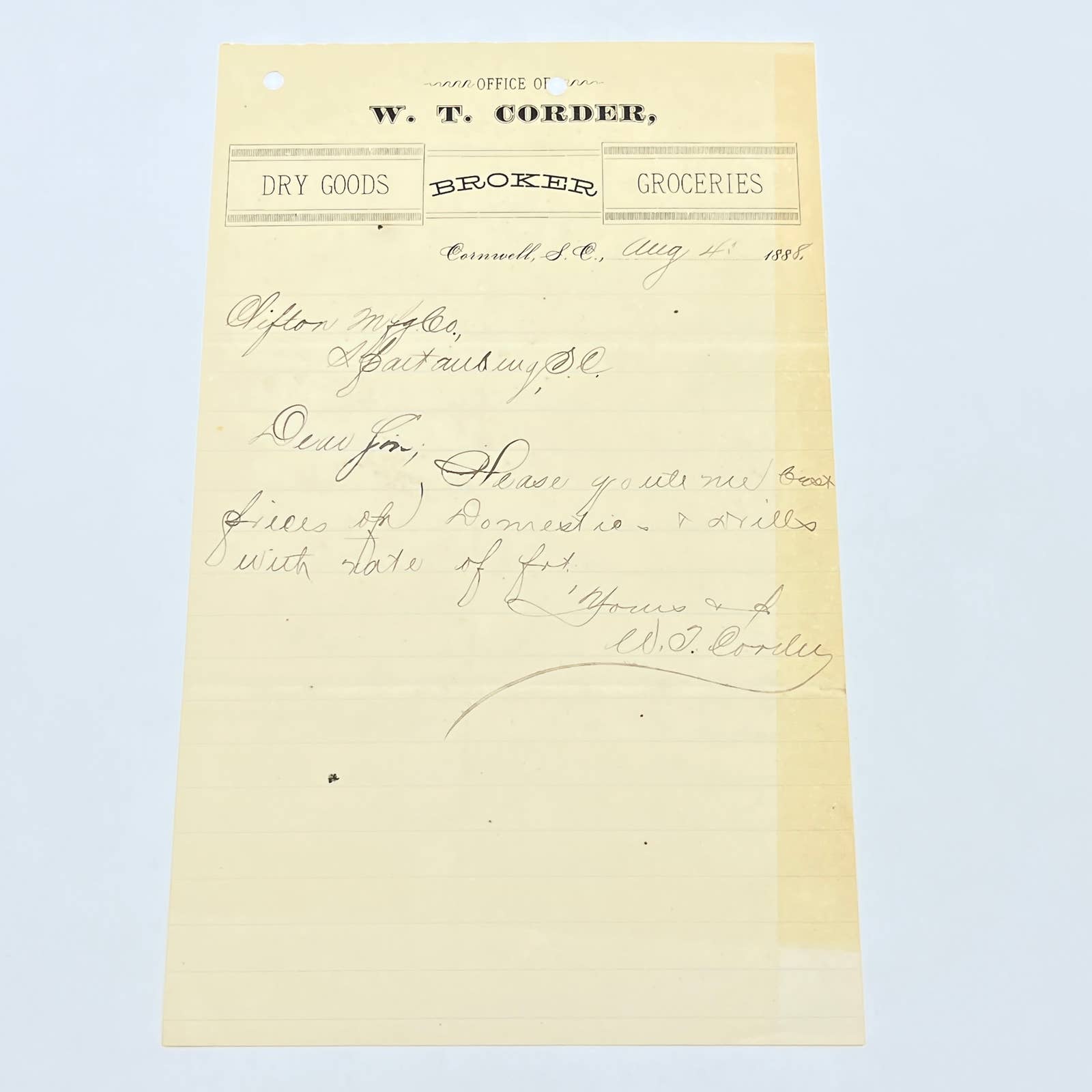 1888 W.T. Corder Groceries Dry Goods Letterhead Cornwall SC AB9