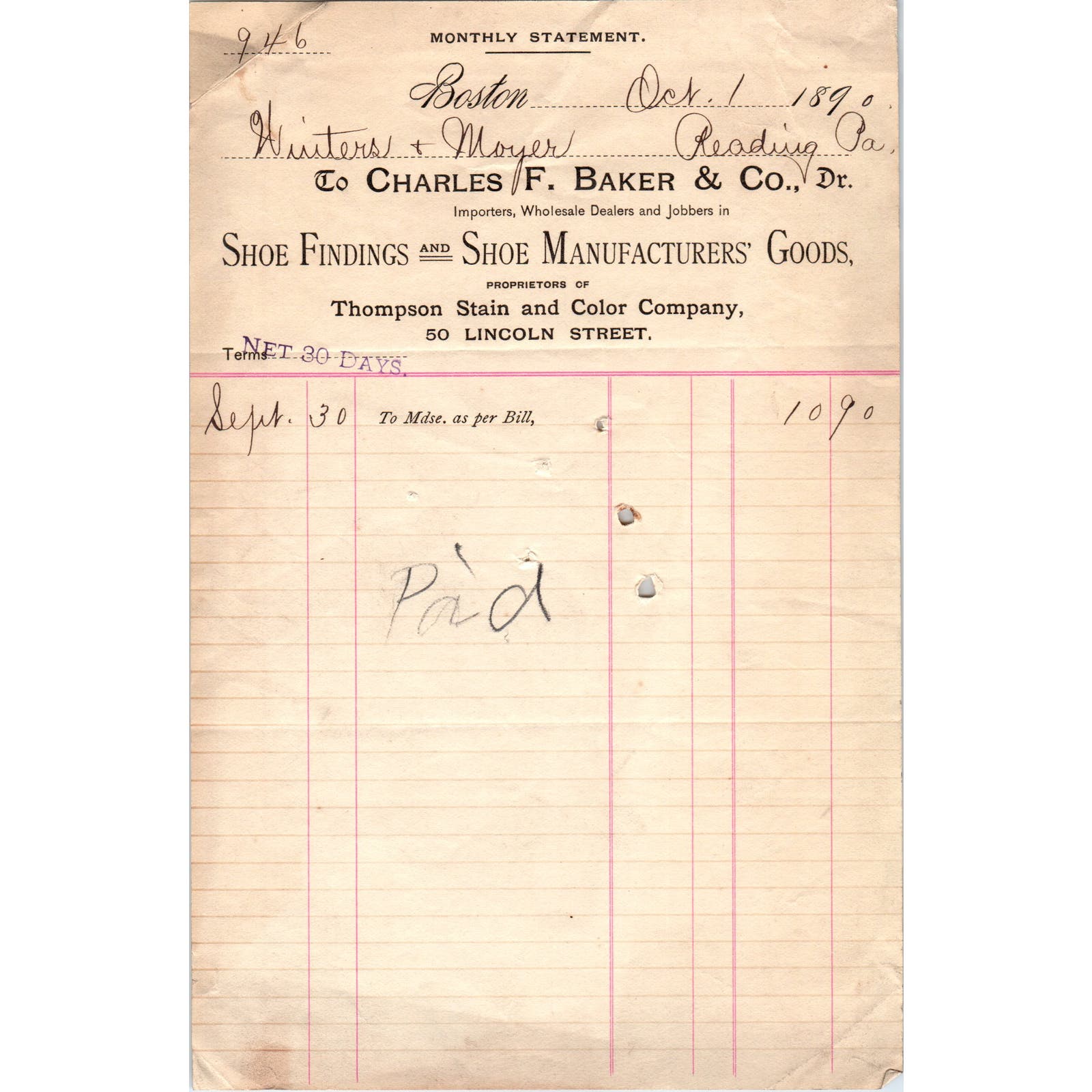1890 Charles F. Baker & Co Shoe Findings Boston Original Billhead Receipt AE7