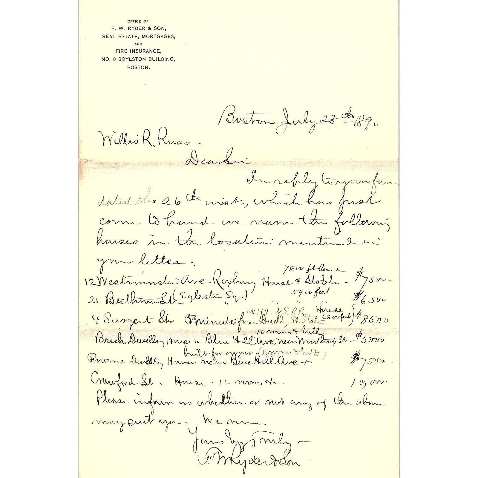 1890 Letterhead F.W. Ryder & Son Real Estate Boston MA AF3-17