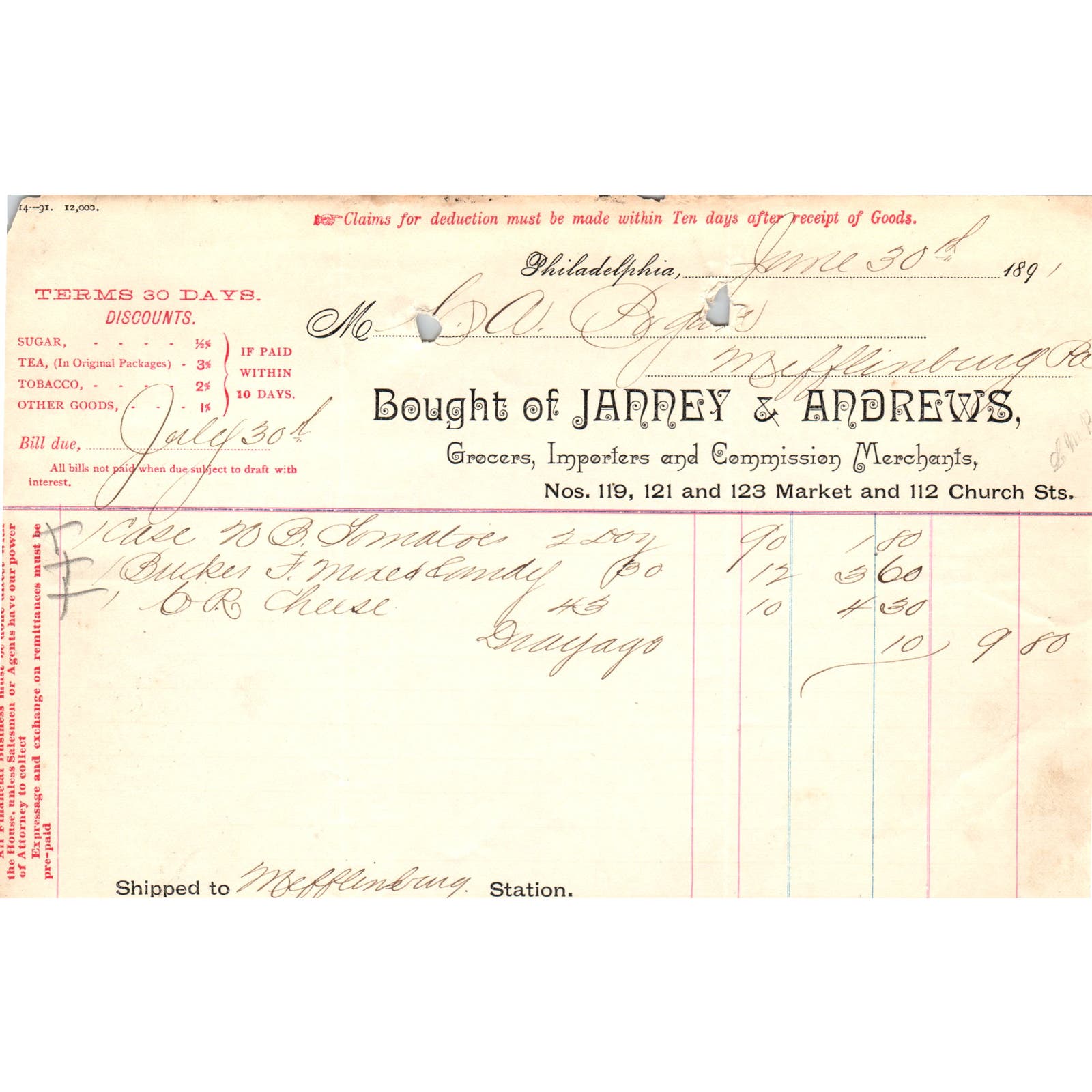 1891 Janney & Andrews Grocers Philadelphia Billhead Letterhead D17-2