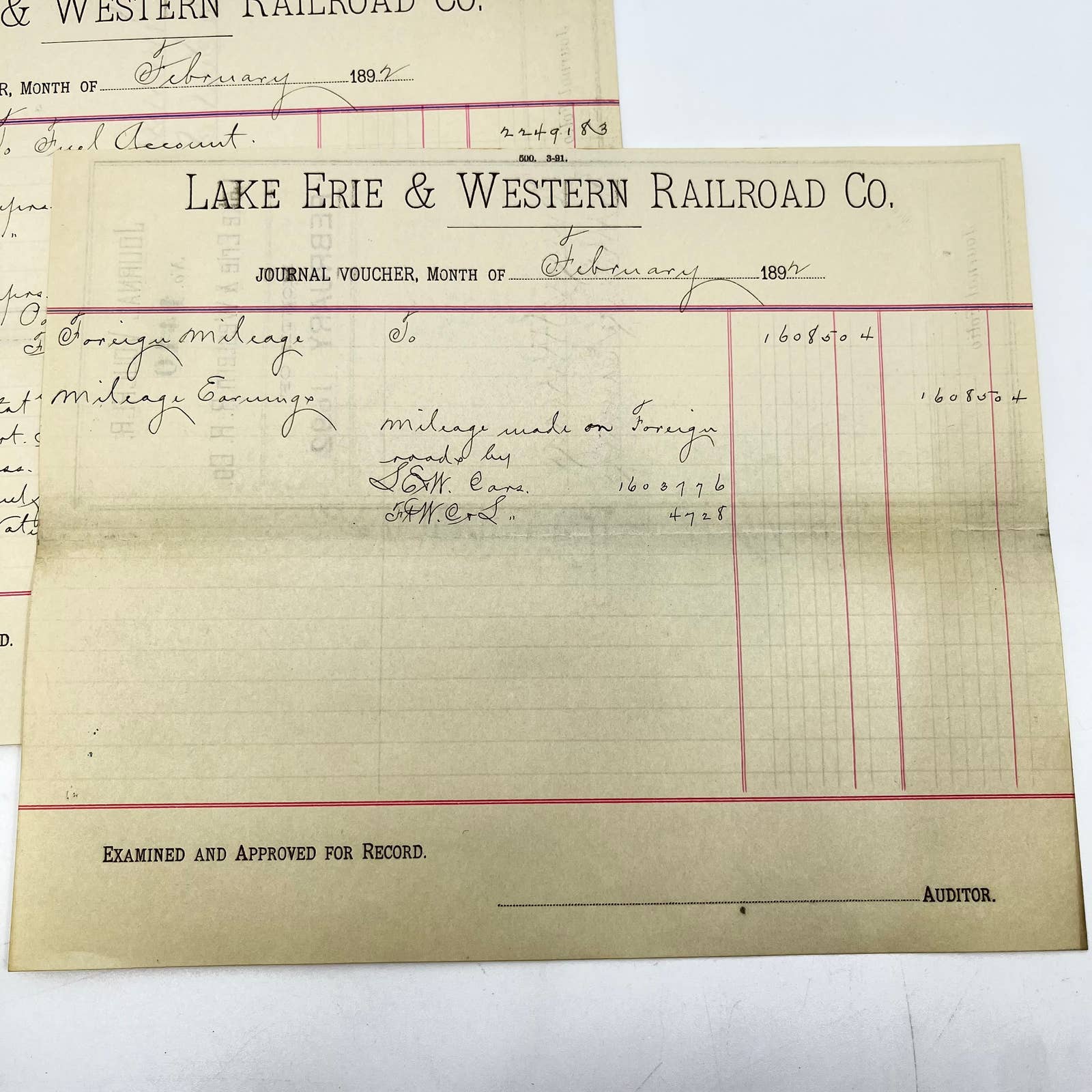 1892 Lake Erie & Western Railroad Co. Journal Voucher RR Lot of 2 AB1-2