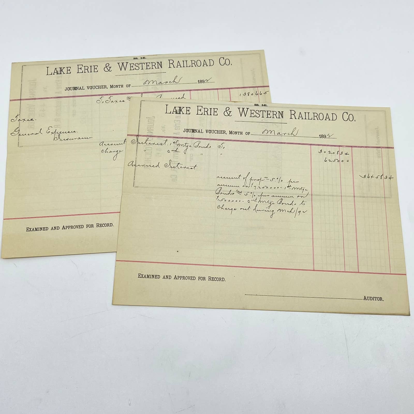 1892 Lake Erie & Western Railroad Co. Journal Voucher RR Lot of 2 AB1-7
