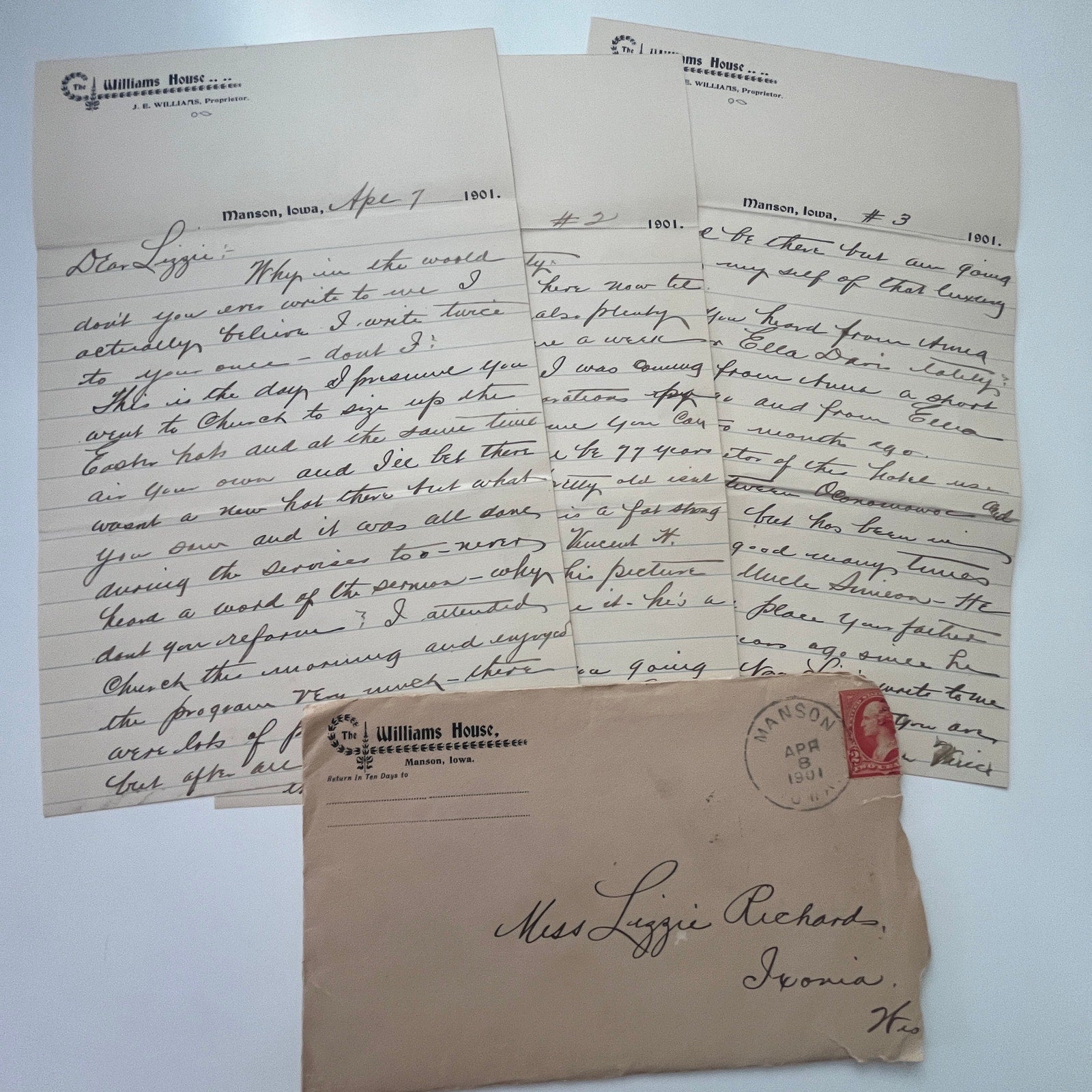 1901 The Williams House Manson Iowa to Lizzie Richards Ixonia WI Handwritten Letter & Envelope AI9-H6