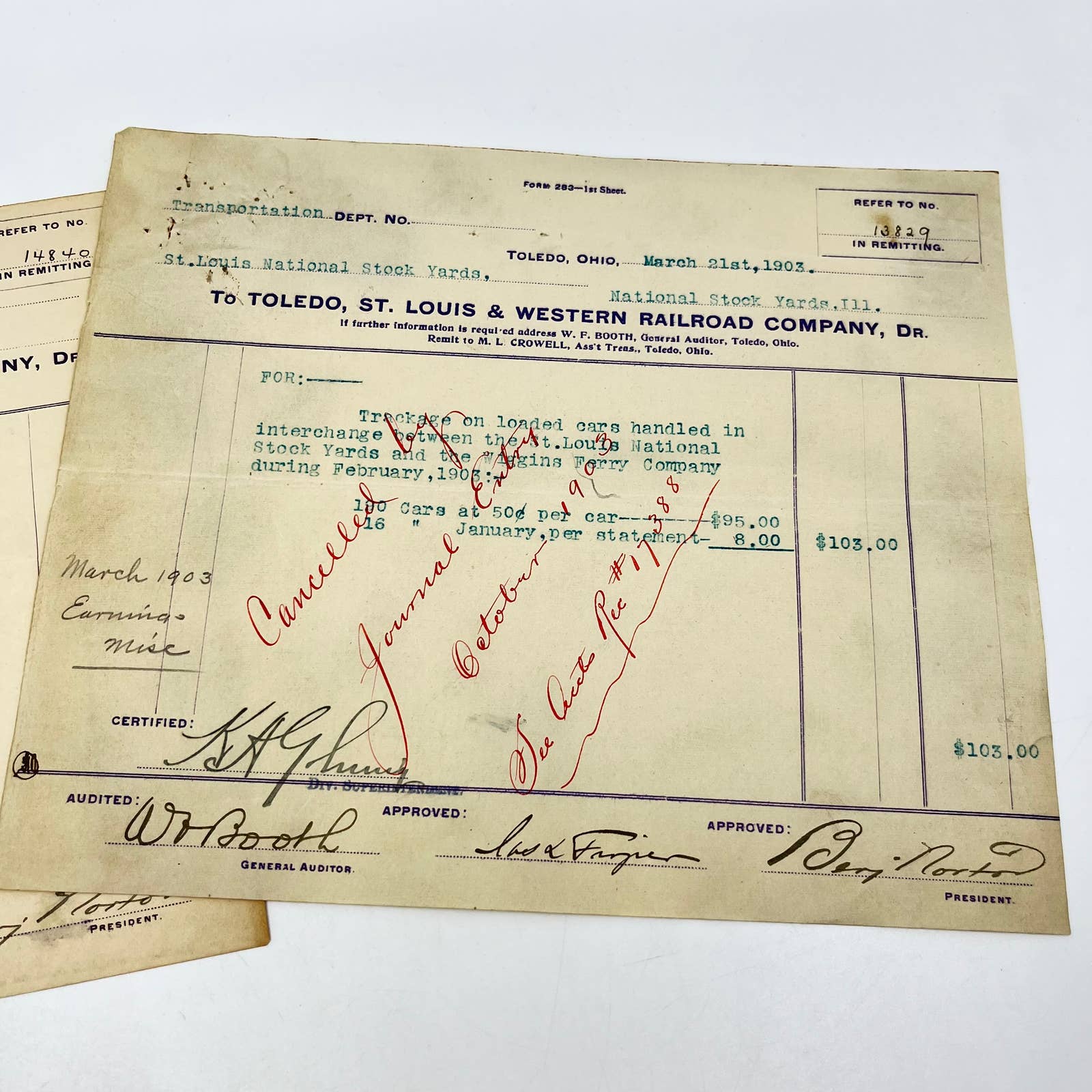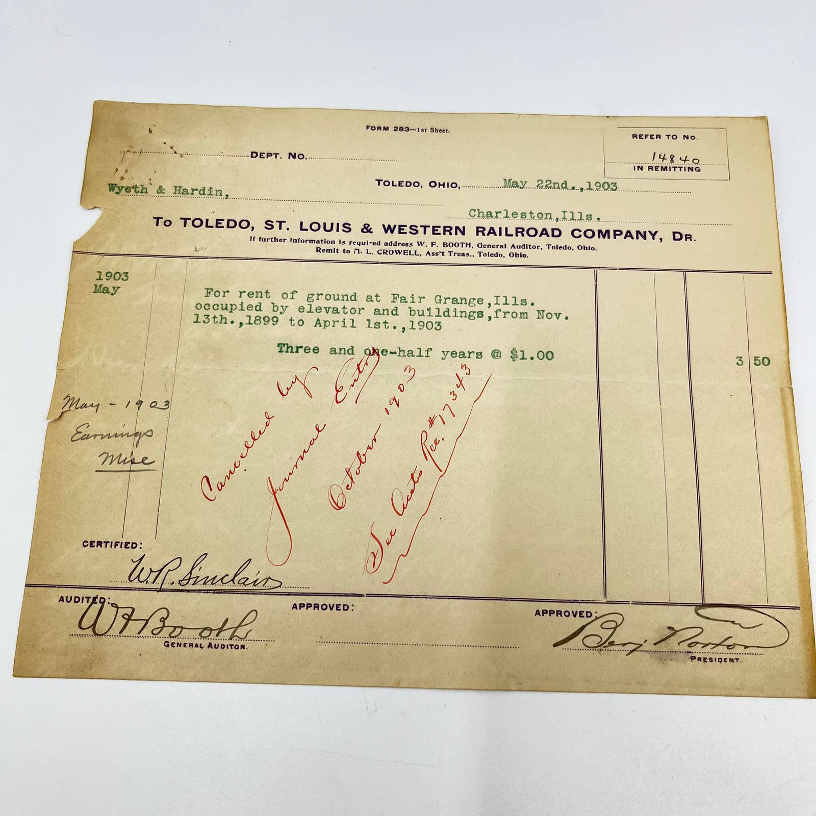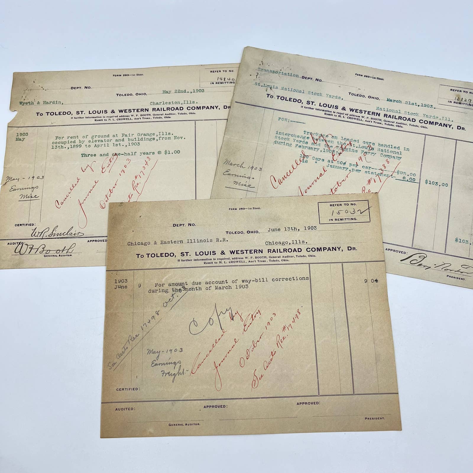 1903 Toledo, St. Louis & Western Railroad RR Billhead Receipt Lot of 3 AA9-1