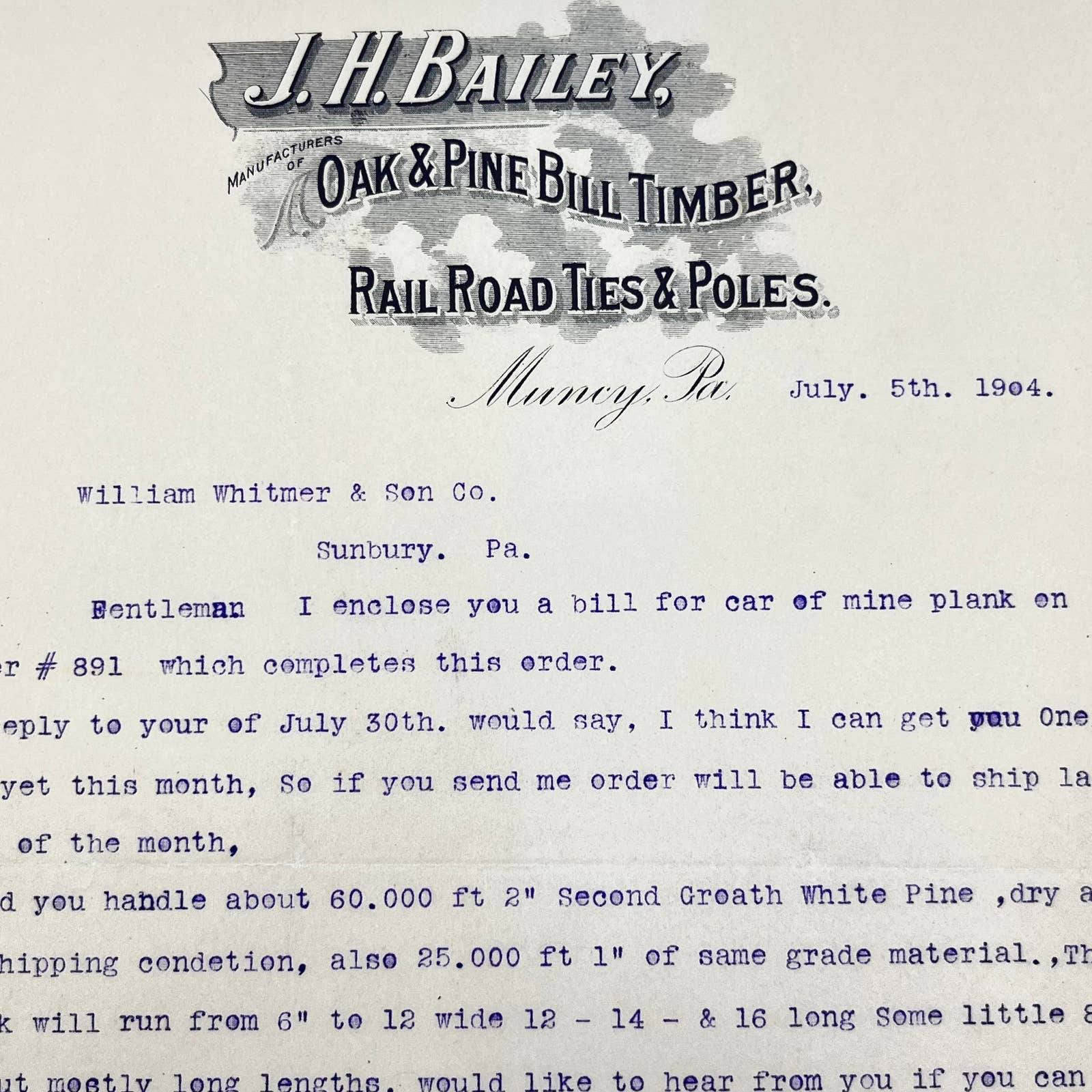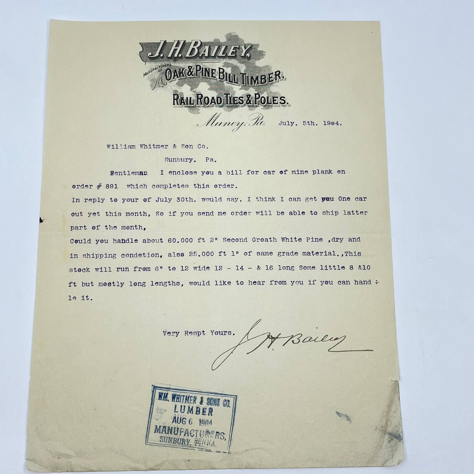 1904 J.H. Bailey Oak & Pine Timber Railroad Ties & Poles Muncy PA Letterhead AB2