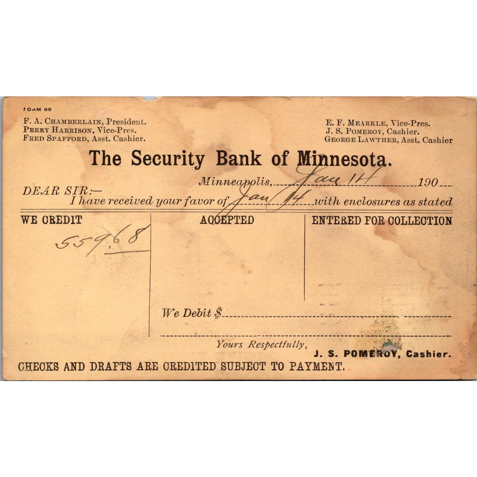 1907 The Security National Bank of Minnesota Postal Mailing Card AJ4-H3