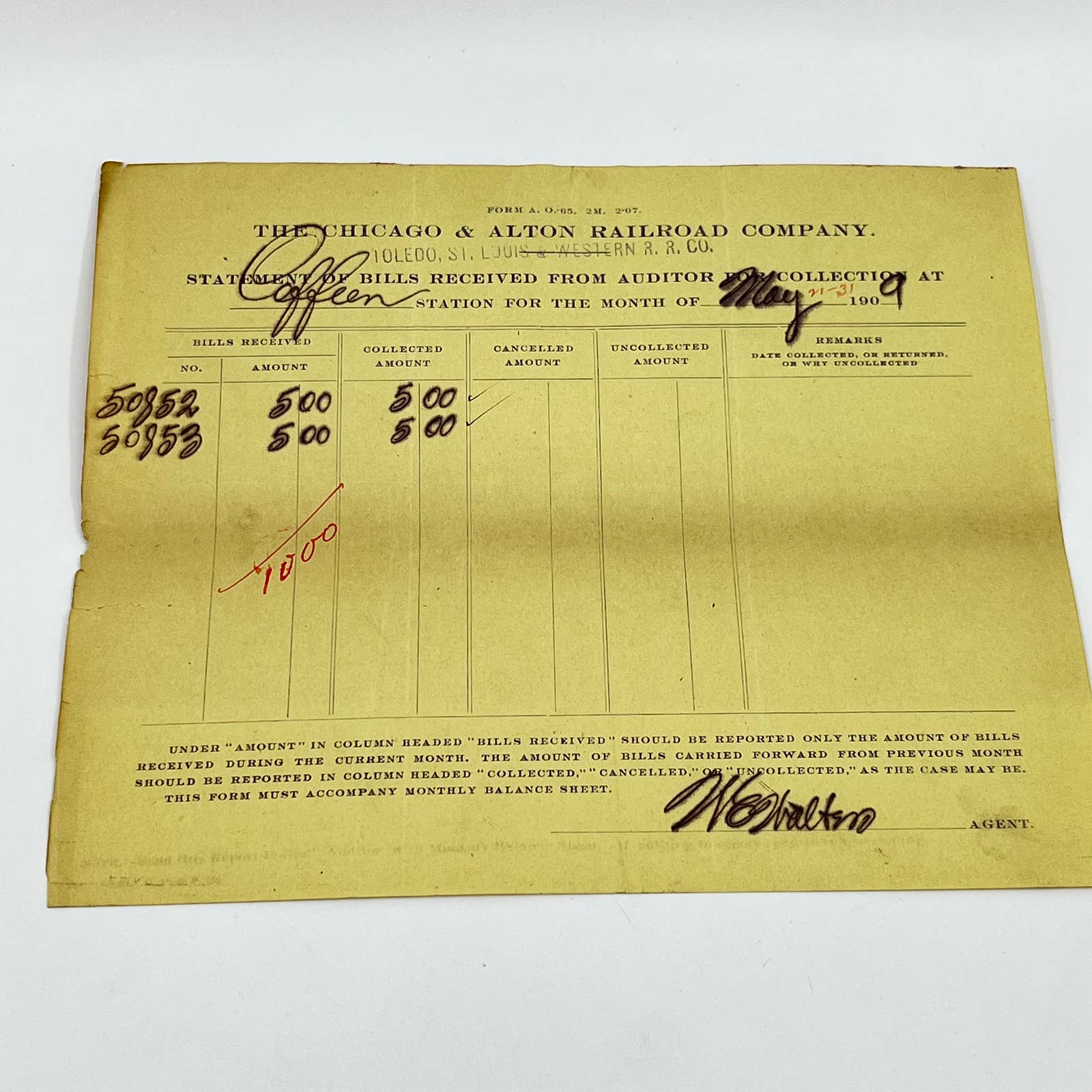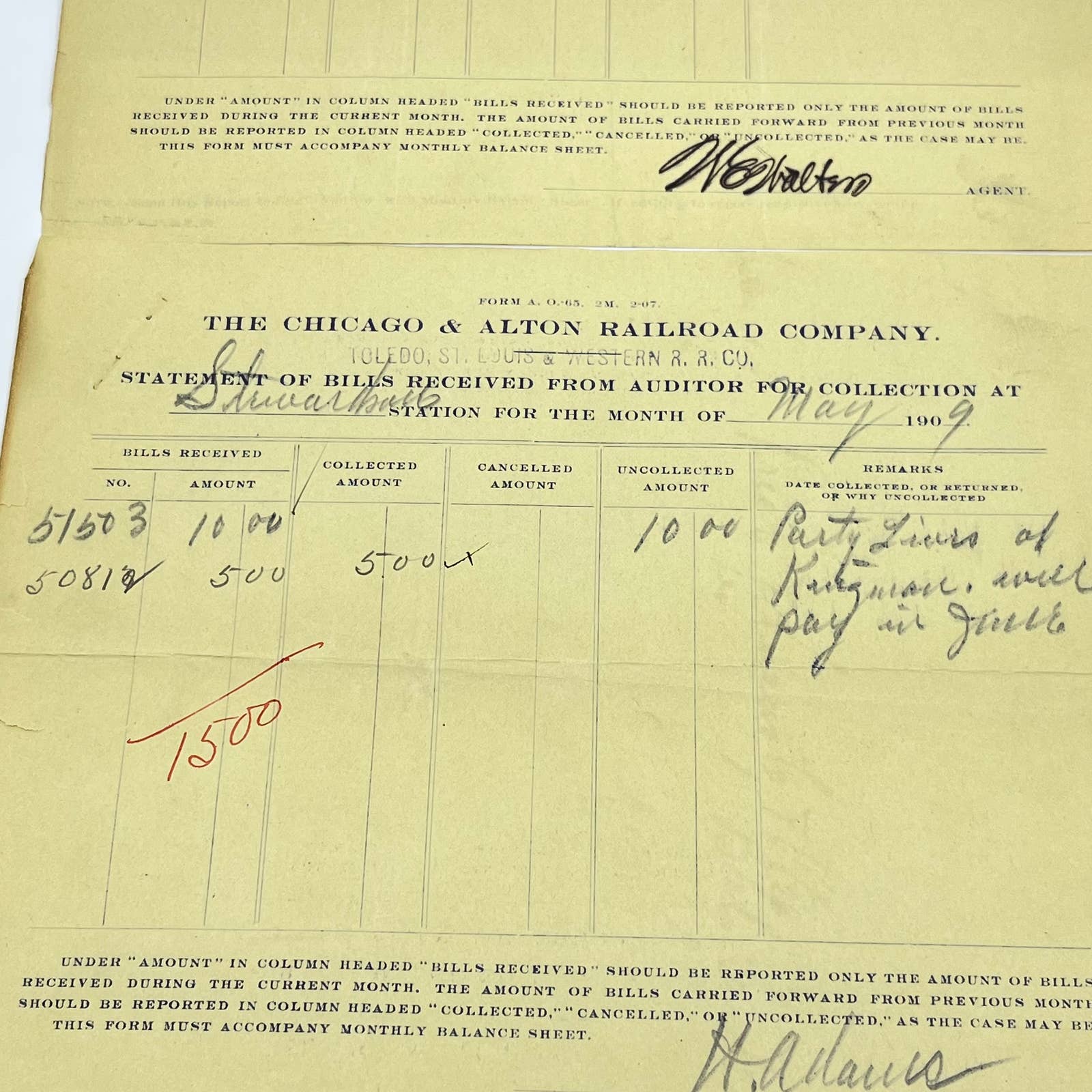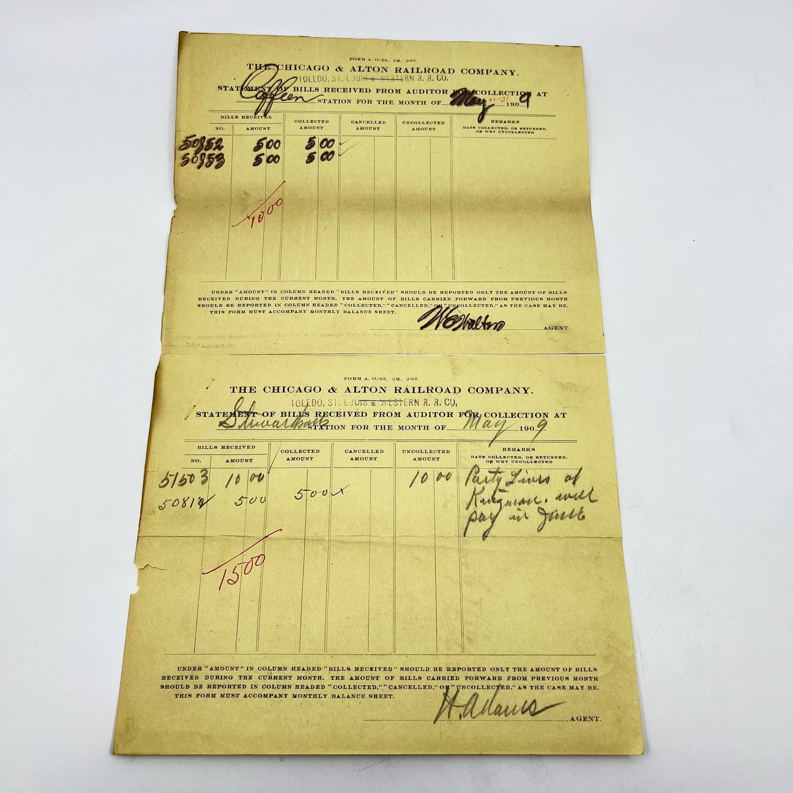 1909 Chicago & Alton Railroad Company Statement of Bills Received Lot of 2 AB1-2