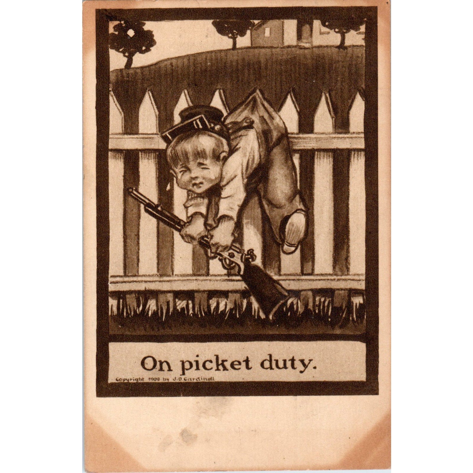1909 On Picket Duty Little Boy Illustration Humor J.D. Cardinell Postcard PD2