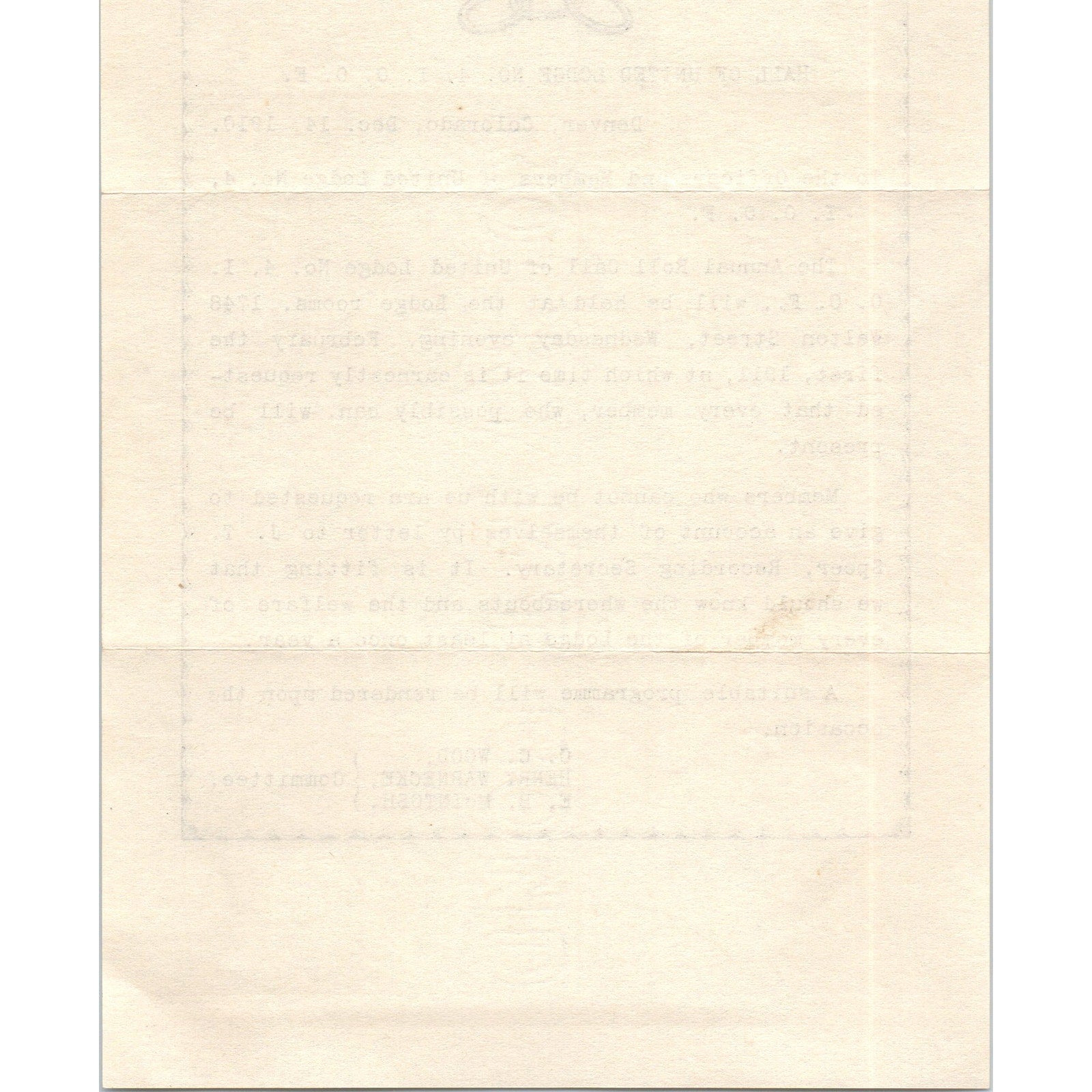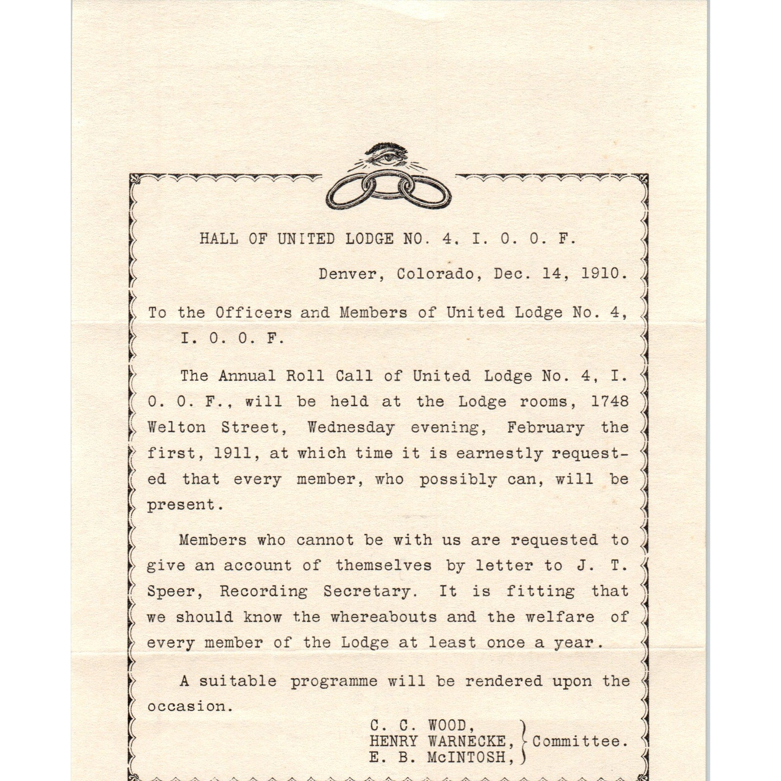 1910 Lodge No. 4.I.O.O.F. Denver CO Odd Fellows Annual Roll Call Flyer AD8-R7