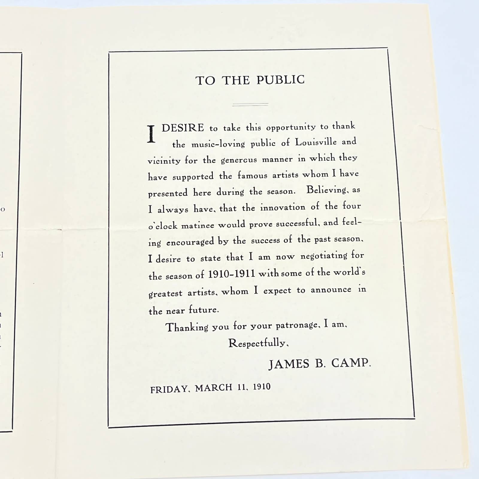the music-loving public of Louisville and vicinity for the generous manner in which they have supported the famous artists whom I have presented here during the season. Believing. as I always have, that the innovation of the four o'clock matince would prove successful, and feeling encouraged by the success of the past season.