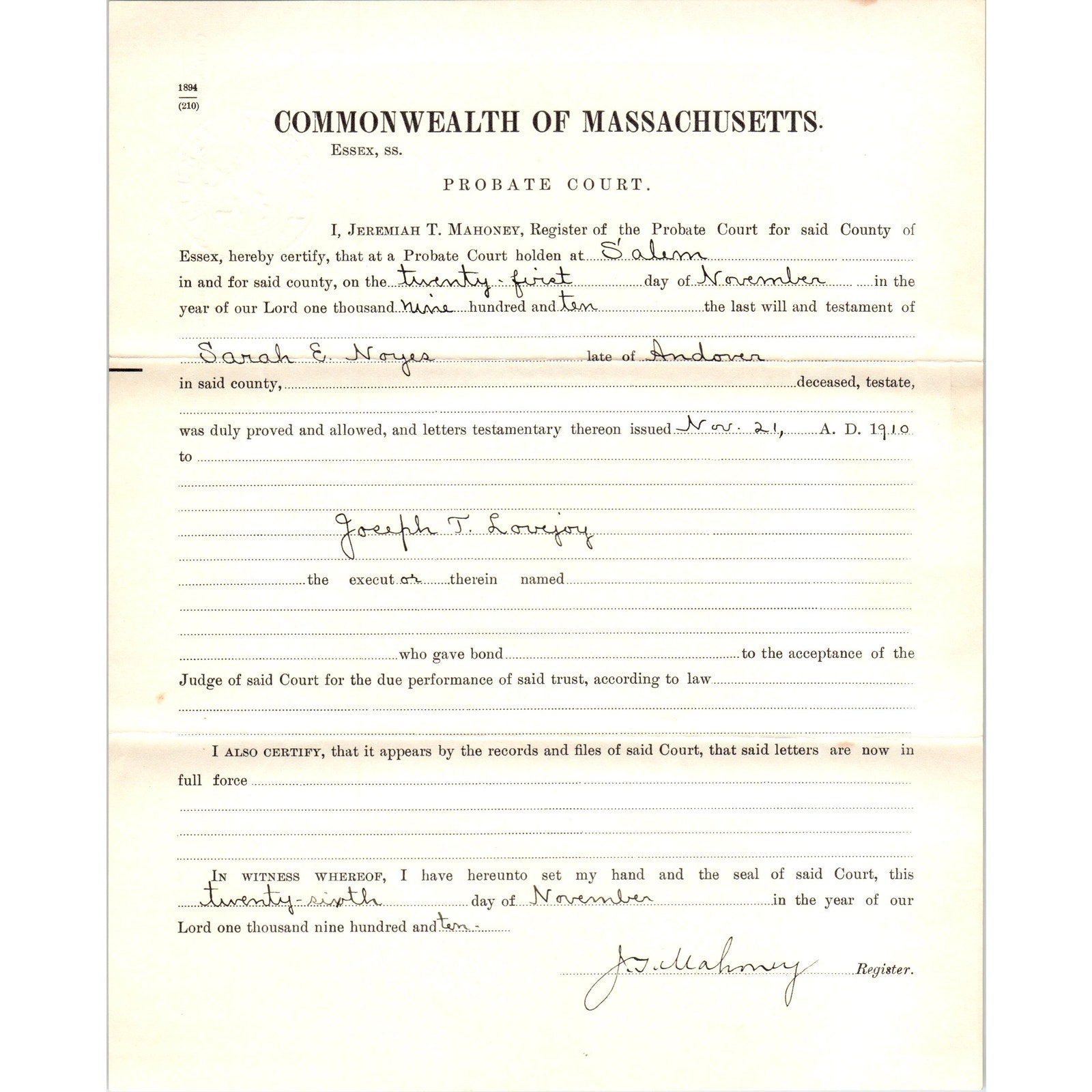 1910 Salem MA Probate Court Last Will and Testament of Sarah E. Noyes D23