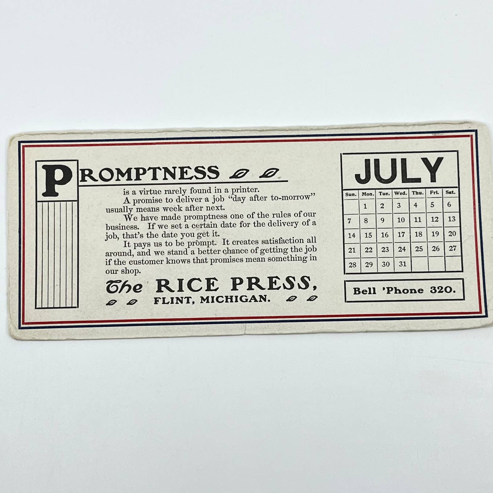 1910s Blotter Card The Rice Press Promptness July Calendar Flint MI SC8