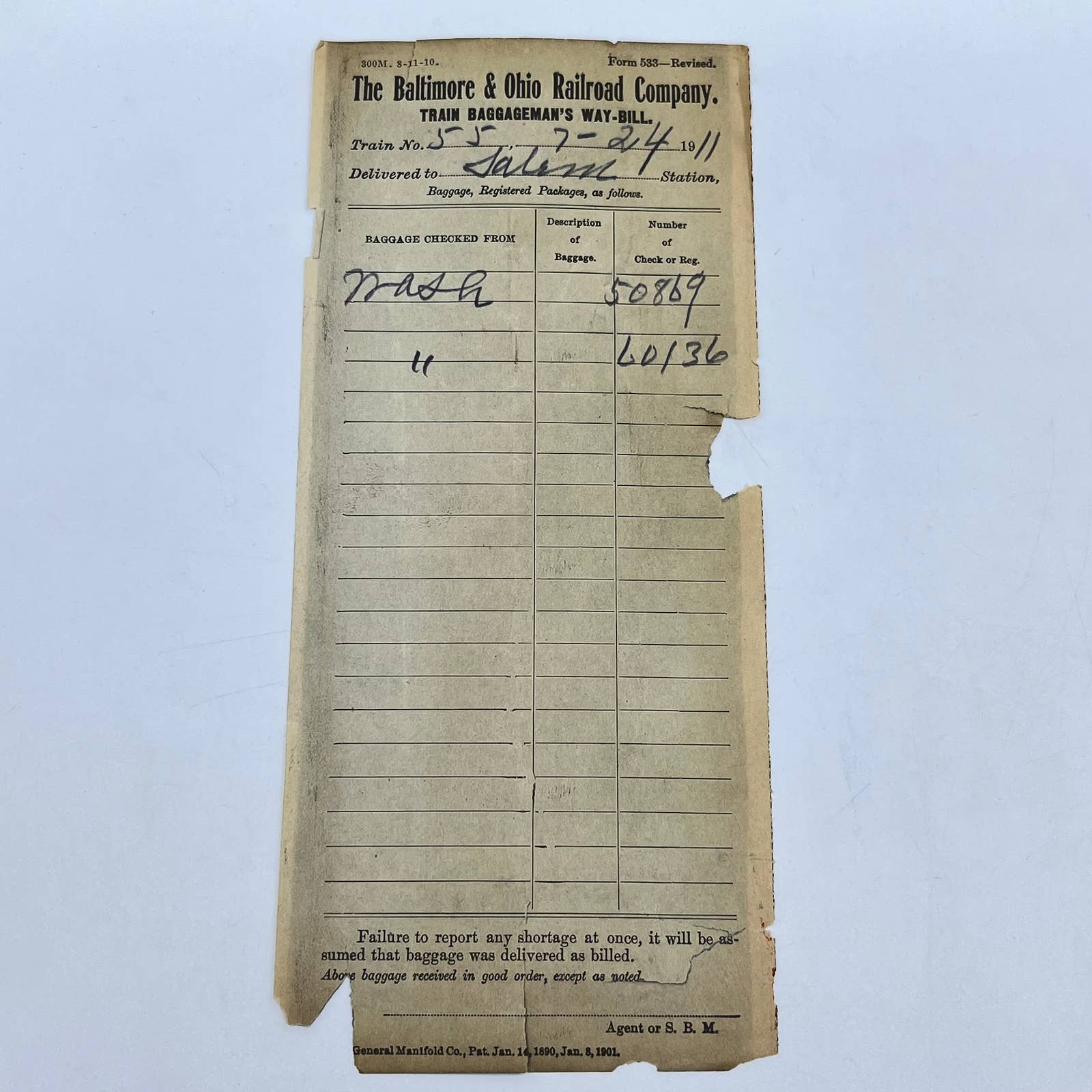 1911 B&O Railroad RR Train Baggageman’s Way-Bill Salem Station AB2
