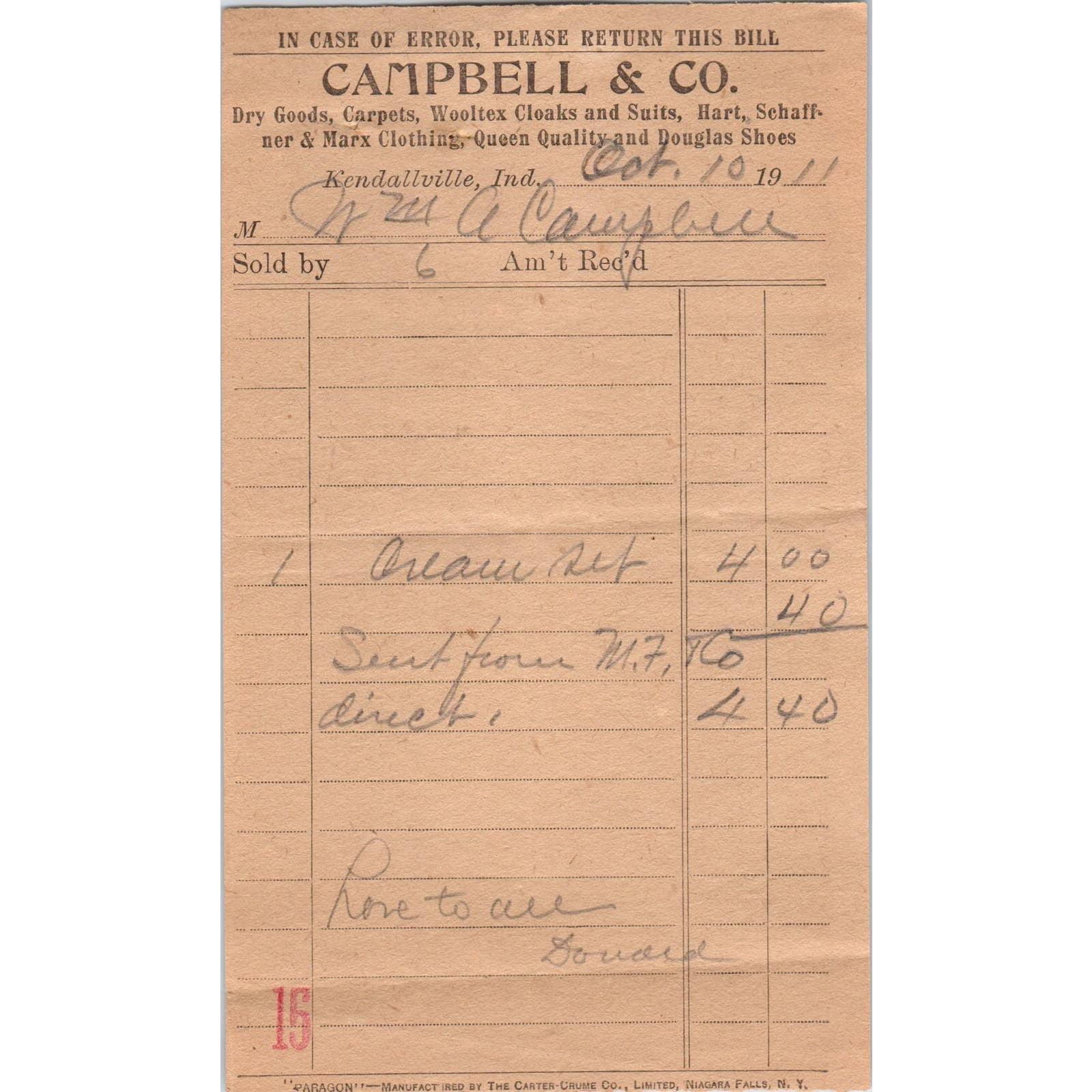 1911 Campbell & Co. Hart Schaffner & Marx Clothes Receipt Kendallville IN AD8