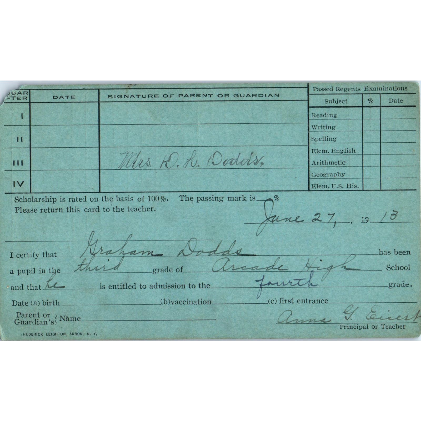 1912-13 Buffalo NY Arcade High School Report Card Graham Dodds AE6