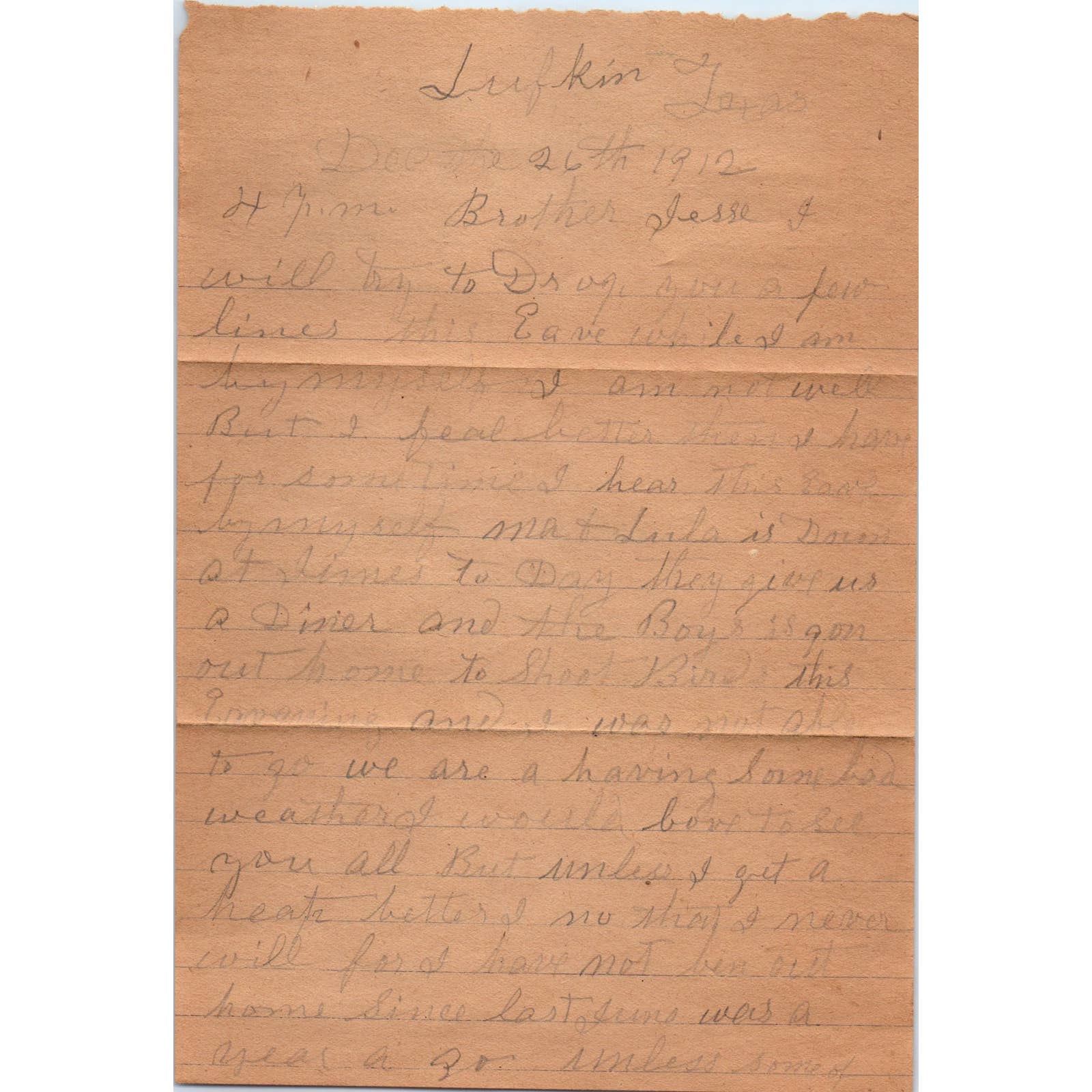 1912 Letter and Envelope W.A. Peavy Lufkin TX to J.M. Peavy Shreve AL AD6