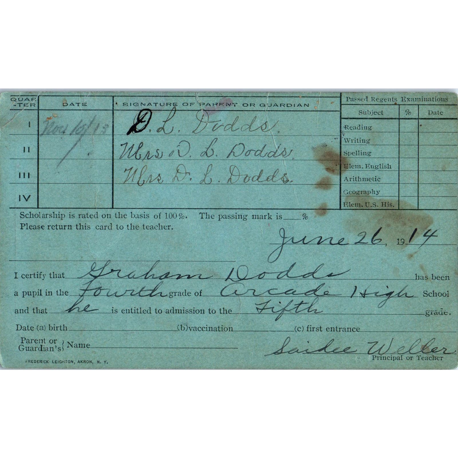 1913-14 Buffalo NY Arcade High School Report Card Graham Dodds AE6
