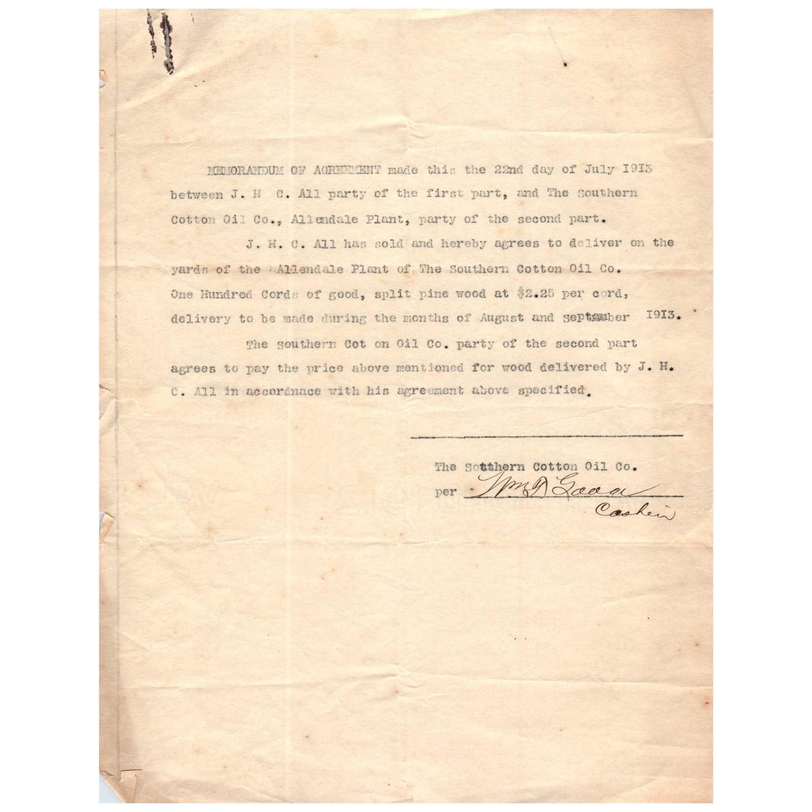 1913 Memorandum of Agreement - The Southern Cotton Oil Co. Allendale SC AC9