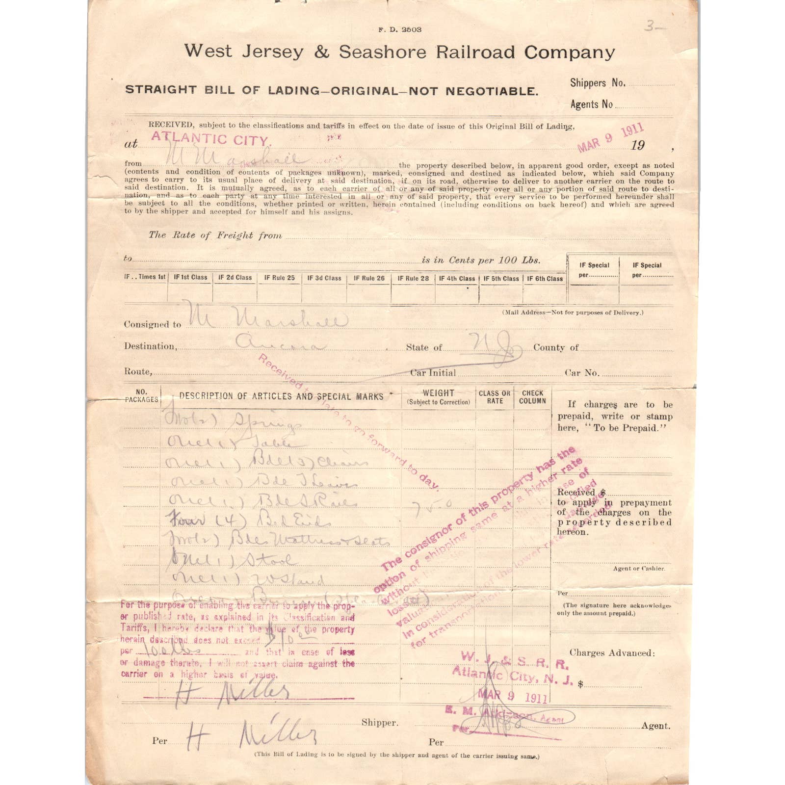 1914 West Jersey & Seashore R.R. Co. Straight Bill of Lading AD8