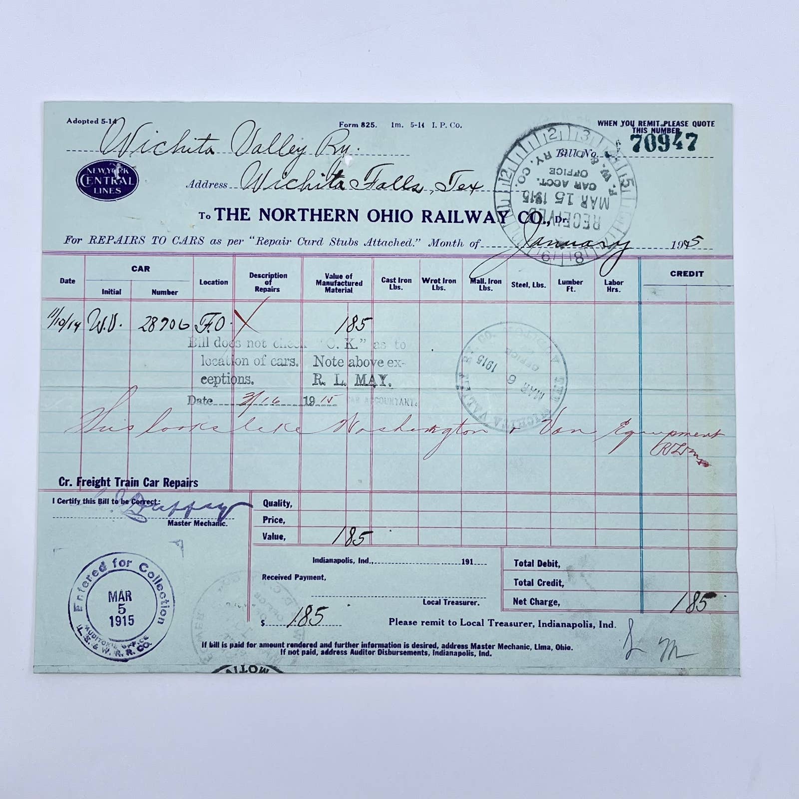 1915 New York Central Lines Northern Ohio Railway Co. Repair Form Stamped AB5