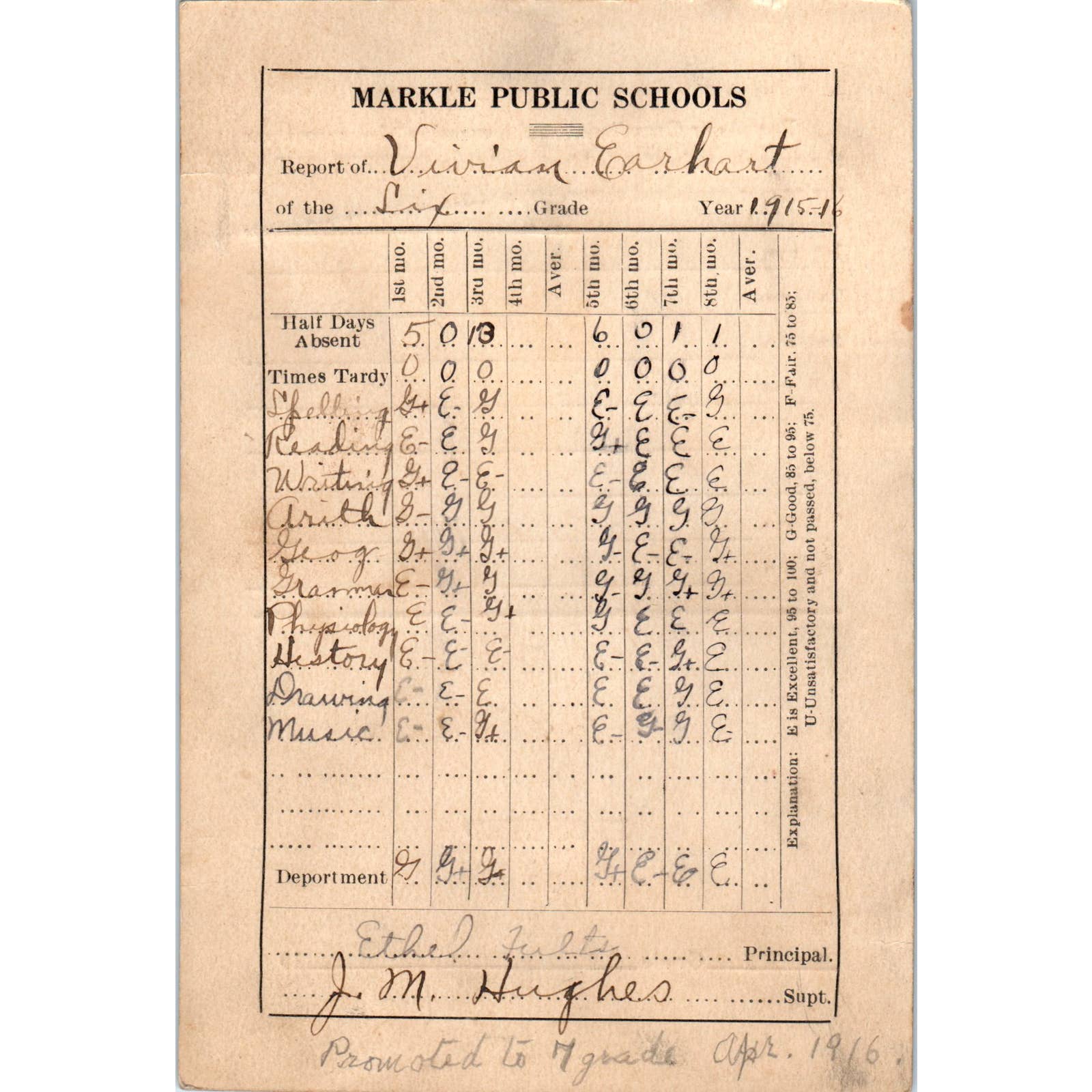 1916 Markle Indiana Public School Report Card Vivian Earhart SF2