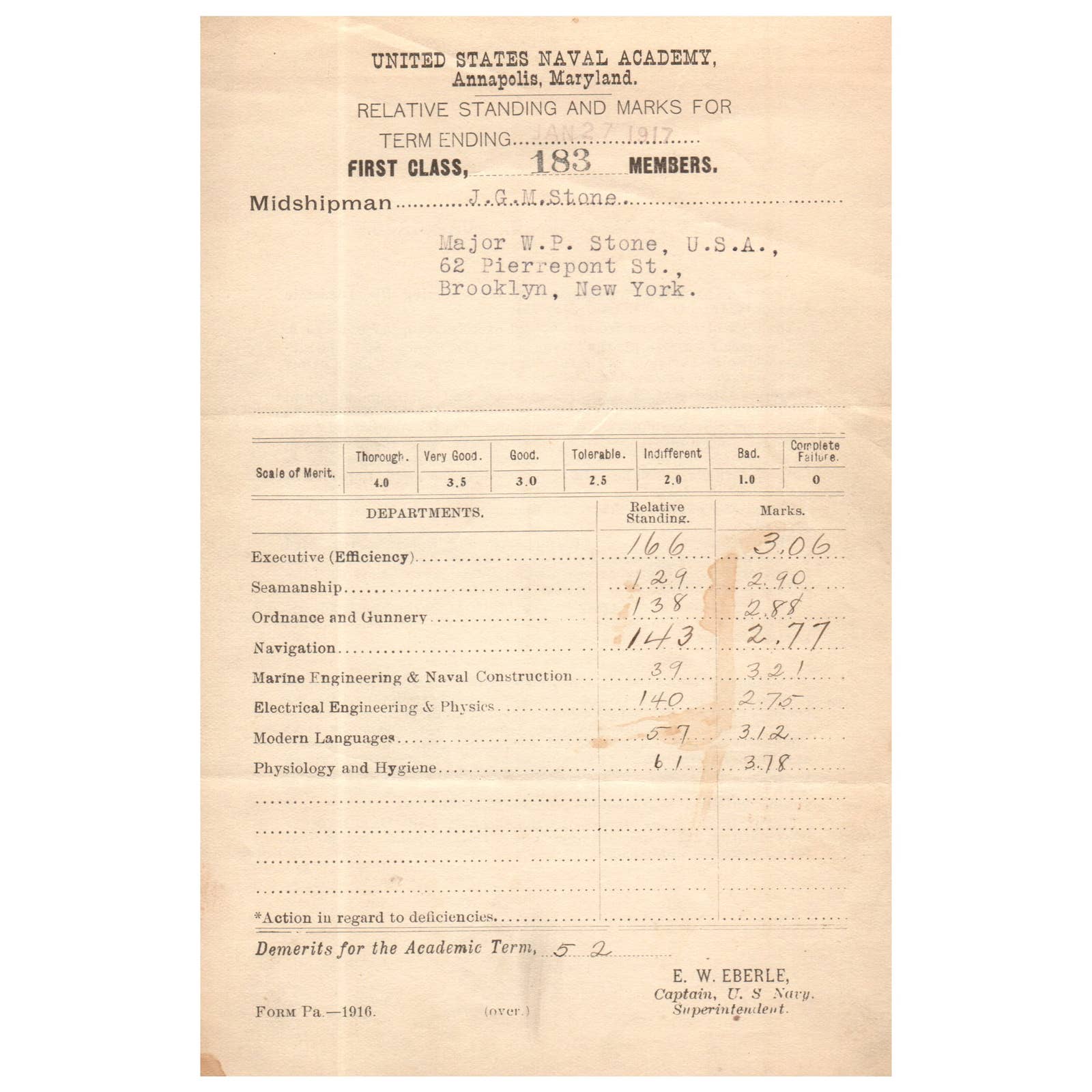1917 Jan WWI Era US Naval Academy Midshipman JGM Stone Report Card EW Eberle AC9