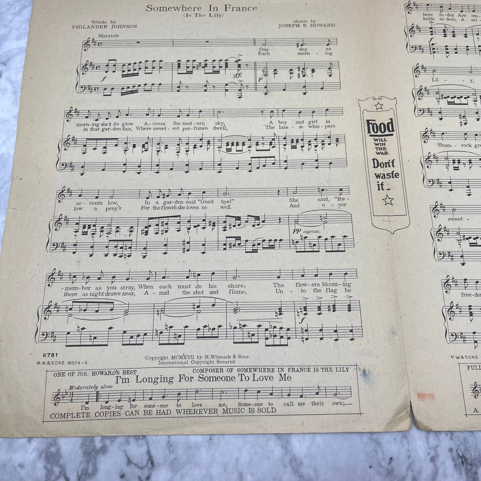 1917 SOMEWHERE IN FRANCE IS THE LILY WW1 Sheet Music by Howard, Johnson TJ4