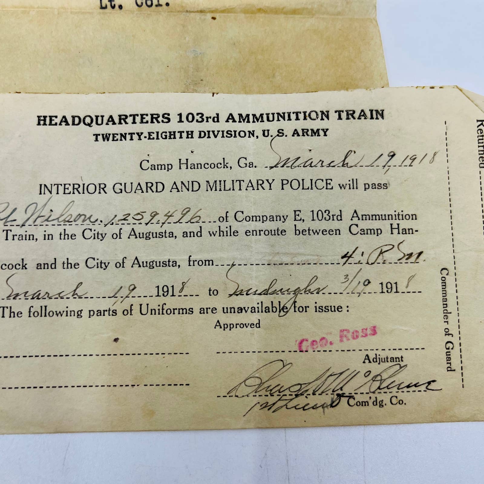 The Appear to be Military Pass forms both from his time at Camp Hancock GA Before going overseas and one from Camp Dix NJ After returning in 1919.