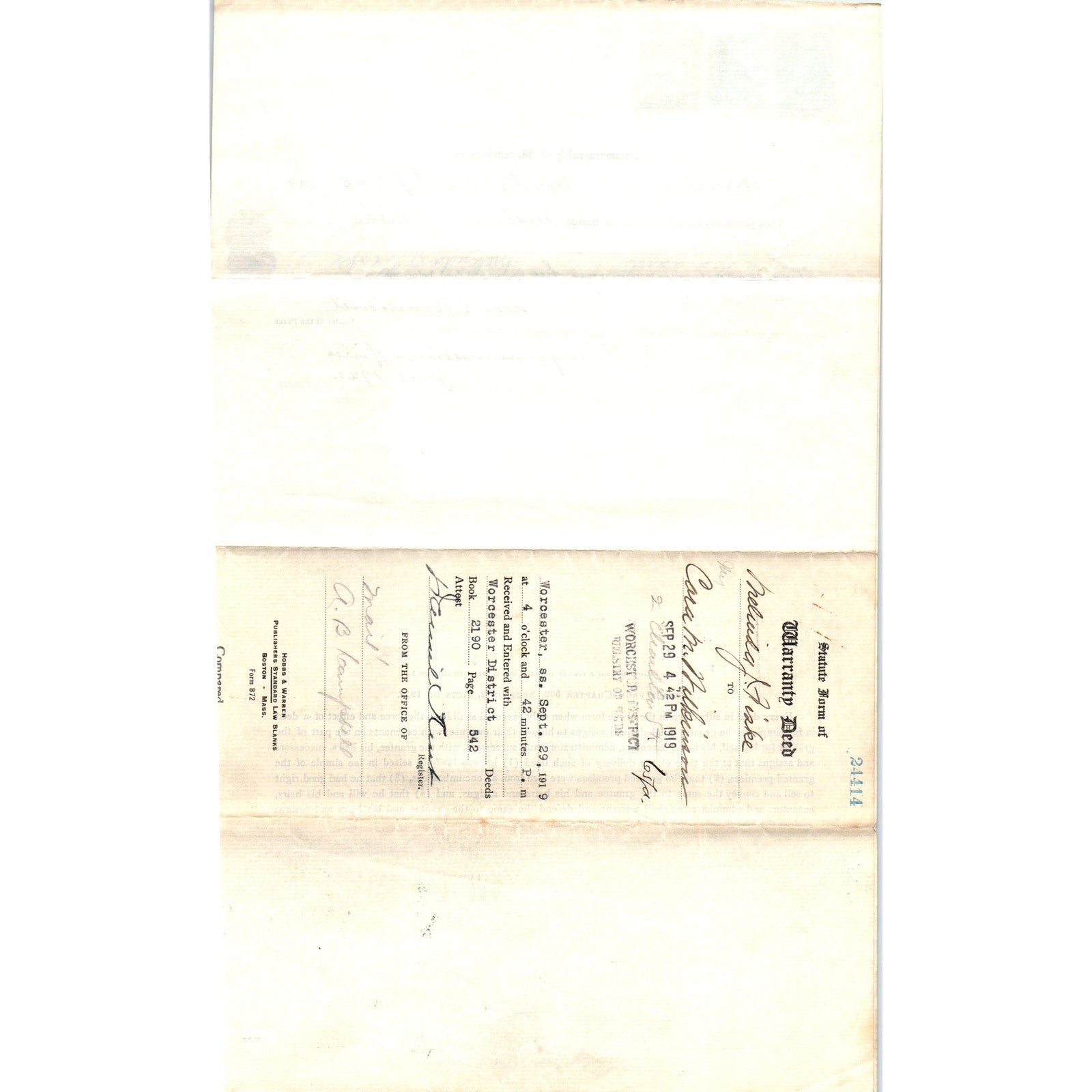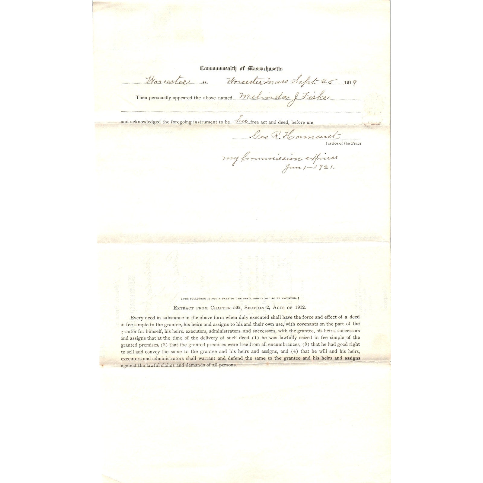 1919 Warranty Deed Melinda J. Fiske to Cara M. Wilkinson Worcester MA AF7-E6