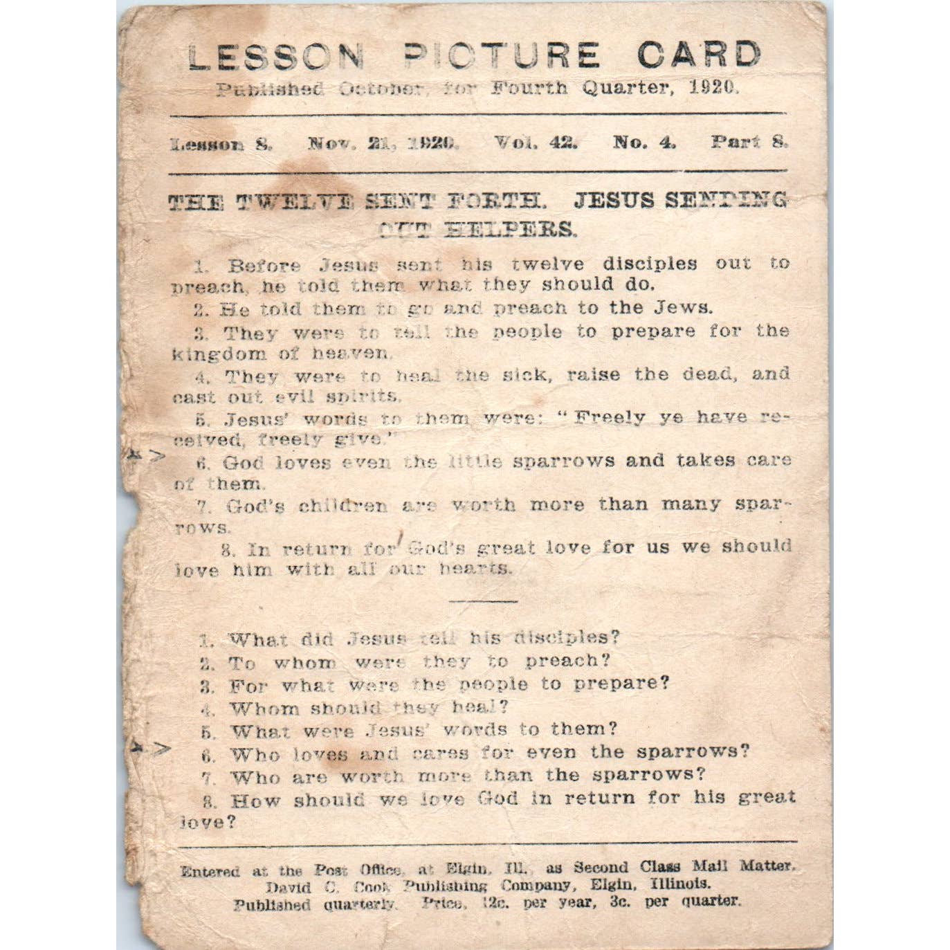 1920 Christian Lesson Picture Card the Twelve Sent Forth Jesus Sending Out Helpers SE5