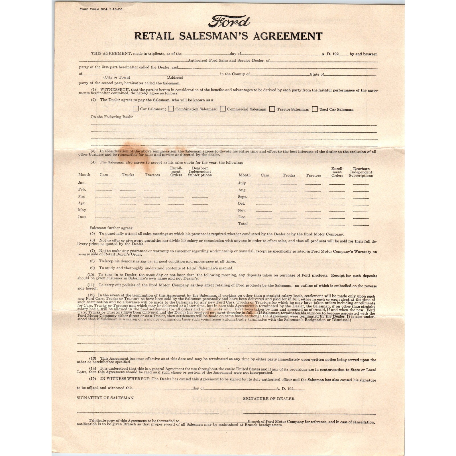 1920s Ford Motor Company Retail Salesman's Agreement Form Blank AD8-R7