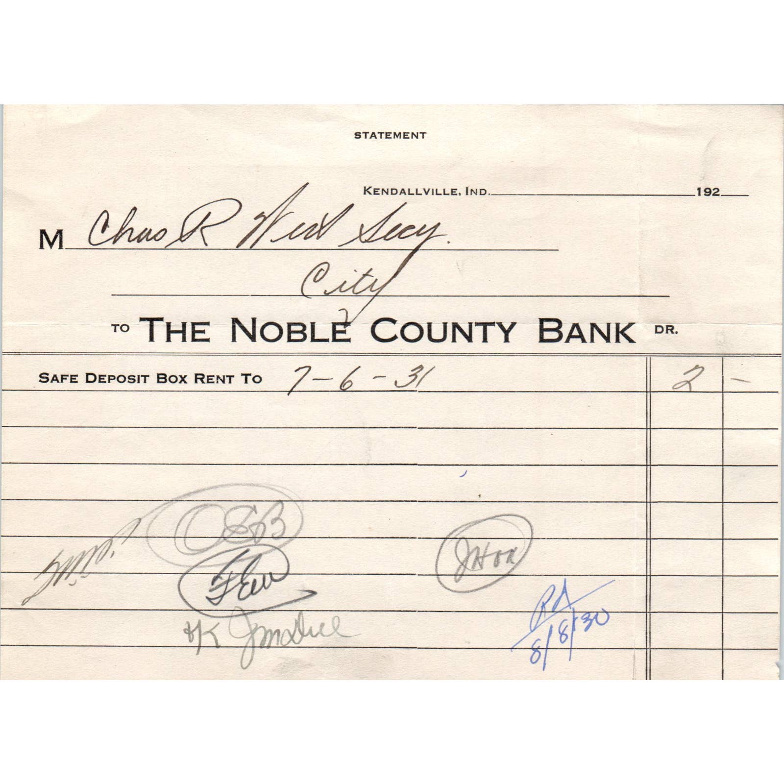 1920s The Noble County Bank Safe Deposit Box Rent Receipt Kendallville IN AD8
