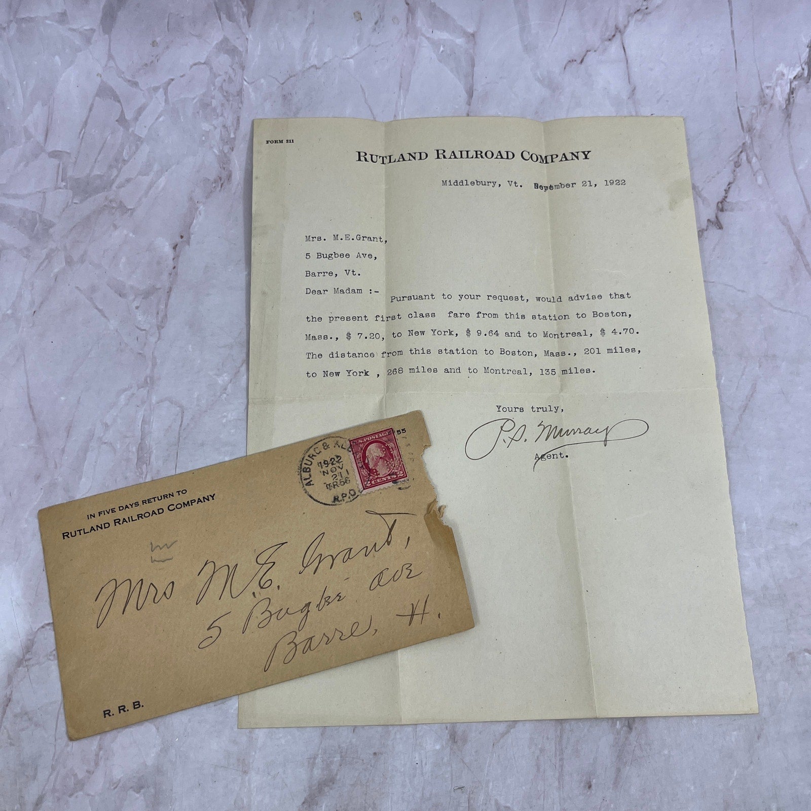 1922 Rutland Railroad Company Middlebury VT Envelope, Letterhead TH2-Y1