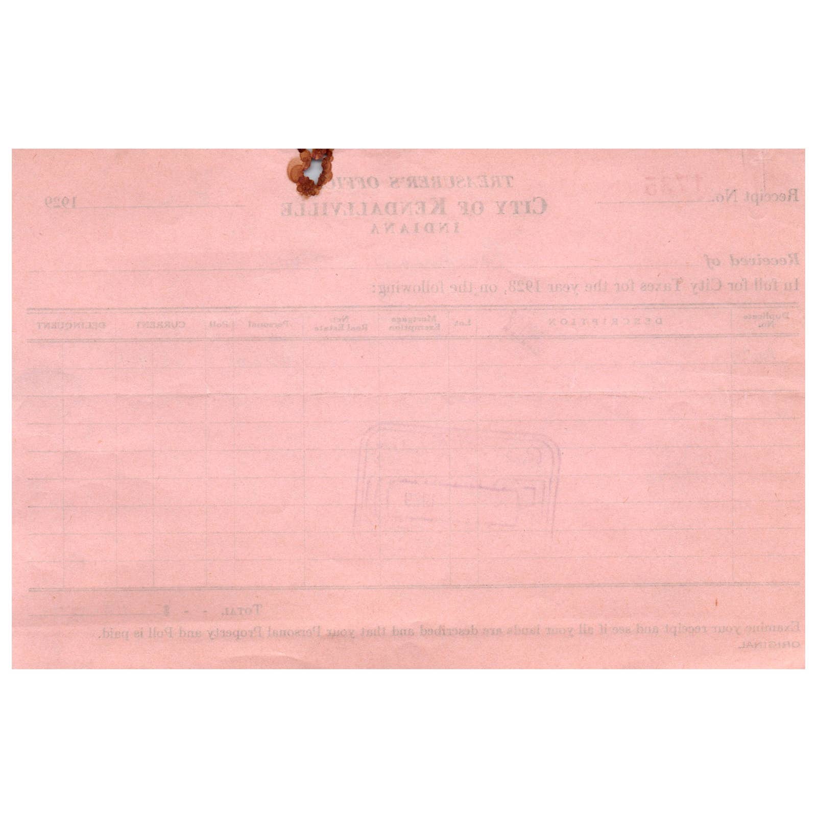 1929 Kendallville IN Noble Cty Treasurer's Office Receipt Beckman & Ron AD8