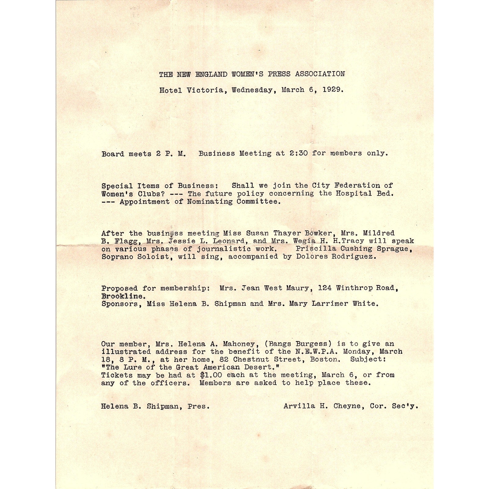 1929 Original Letter from New England Women's Press Association Hotel Victoria Arvilla H. Cheyne, Helena B. Shipman AF3-17