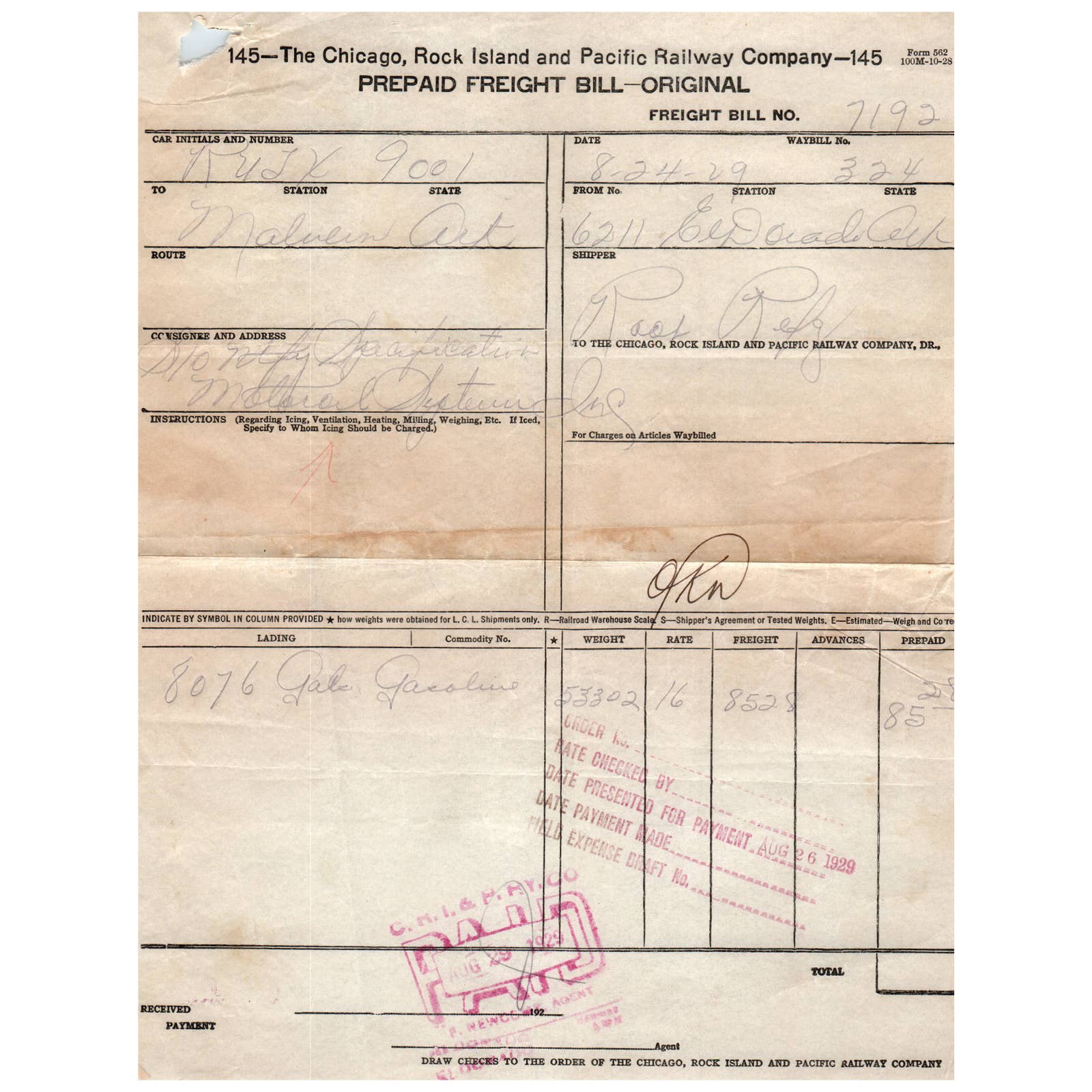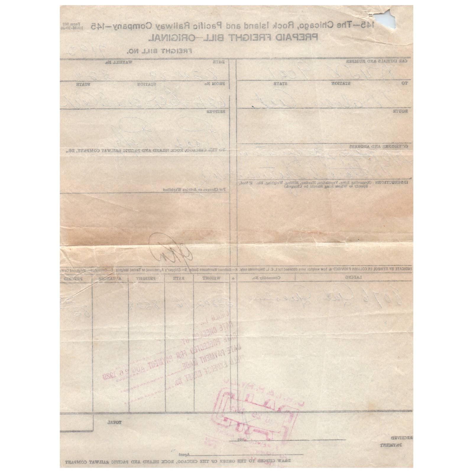 1929 The Chicago, Rock Island and Pacific Railway Company Prepaid Freight Bill AD1