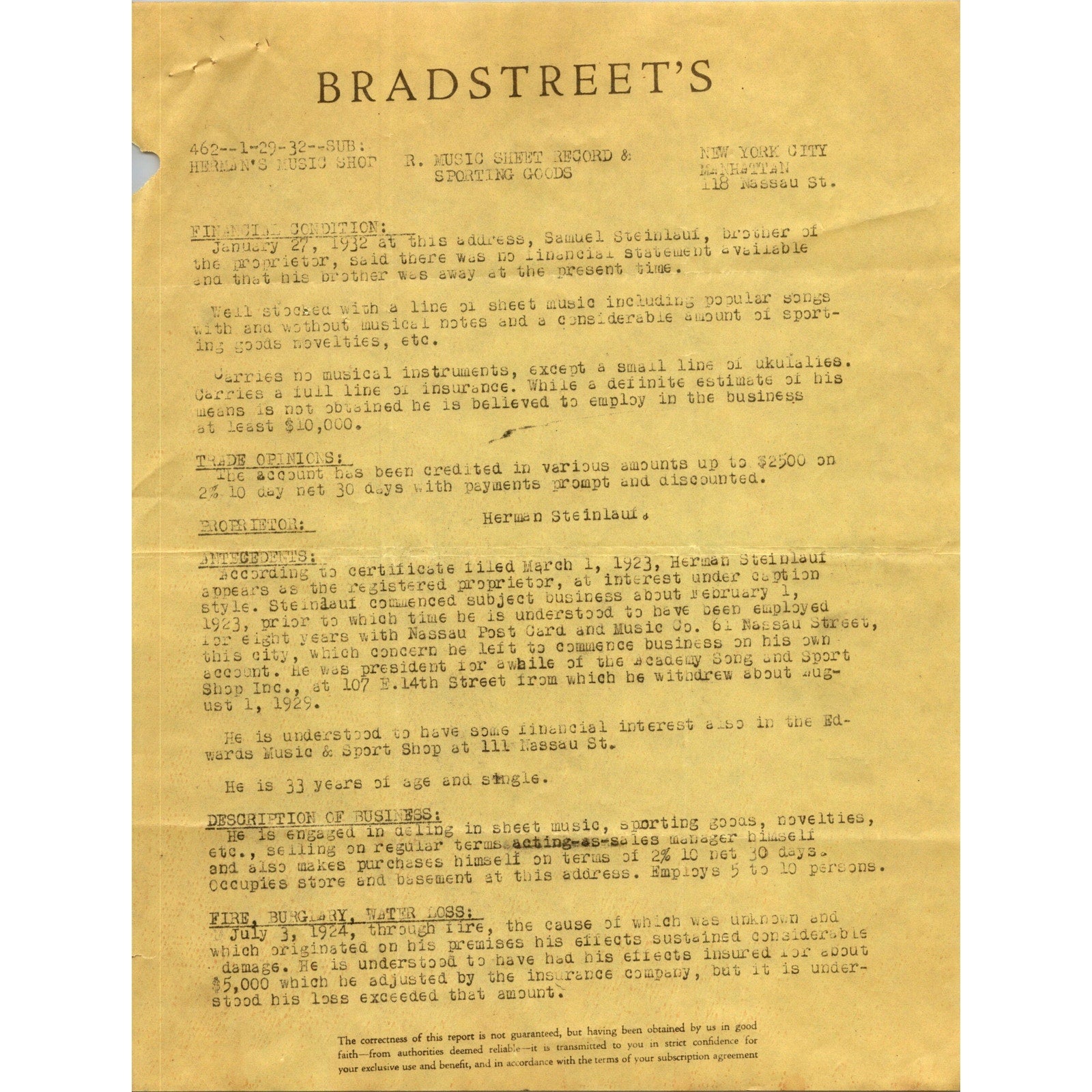 1932 Bradstreet's Business Report on Herman's Music Shop Manhattan NY Herman Steinlauf C30