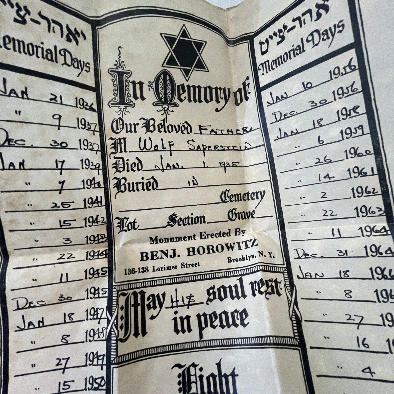 1935 Wolf Saperstein - Benj. Horowitz Brooklyn NY Jewish Memorial Leaflet AI9-H3