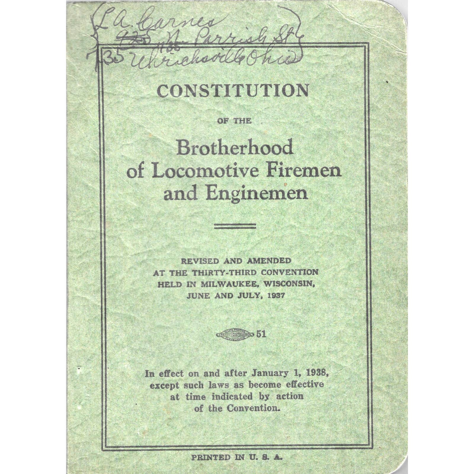 1938 Brotherhood of Locomotive Firemen & Enginemen Constitution Book TJ8-1