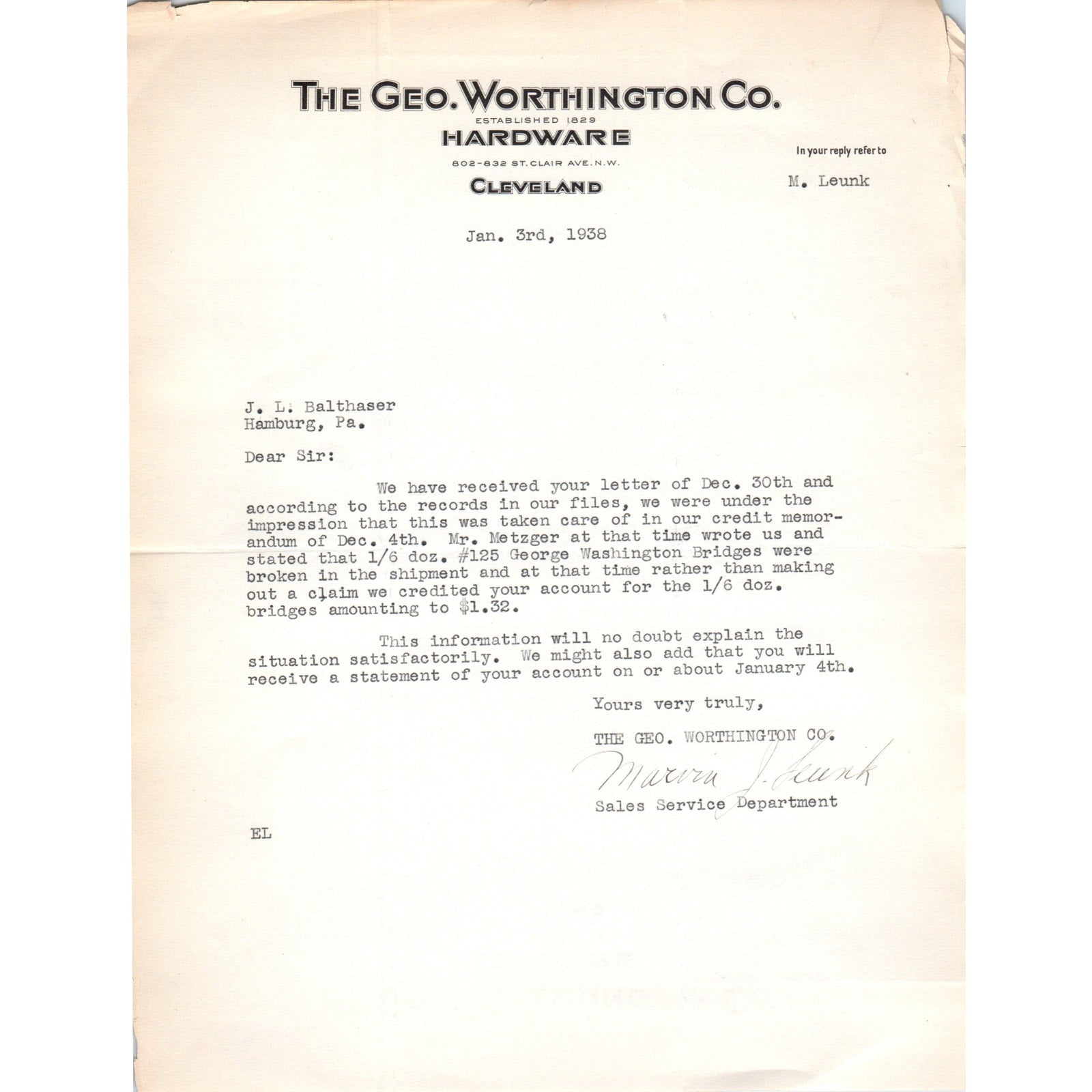 1938 The Geo Worthington Co Hardware M. Leunk Cleveland OH Letterhead Memo D20