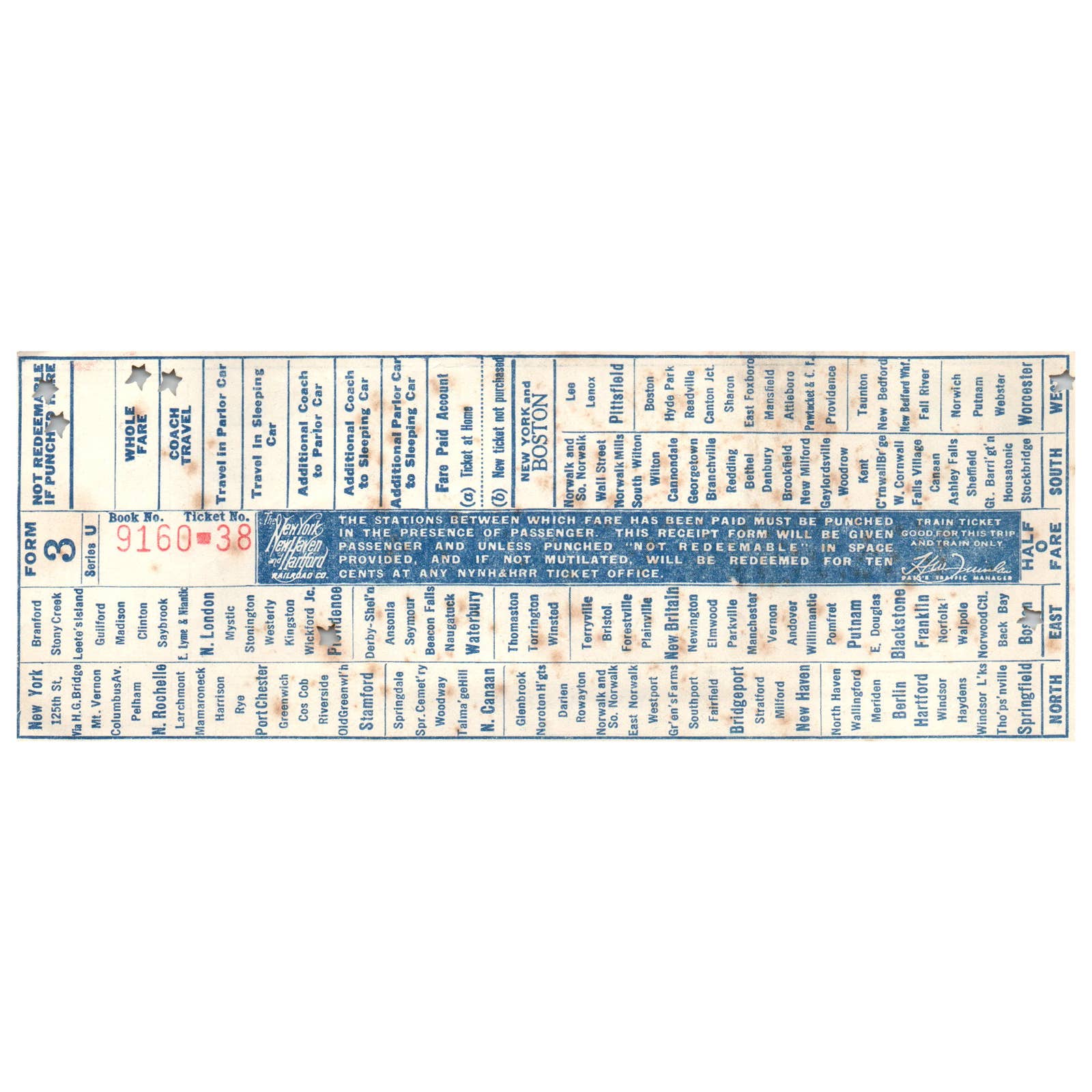 1940s New Haven Railroad Fare Voucher Punched SE4