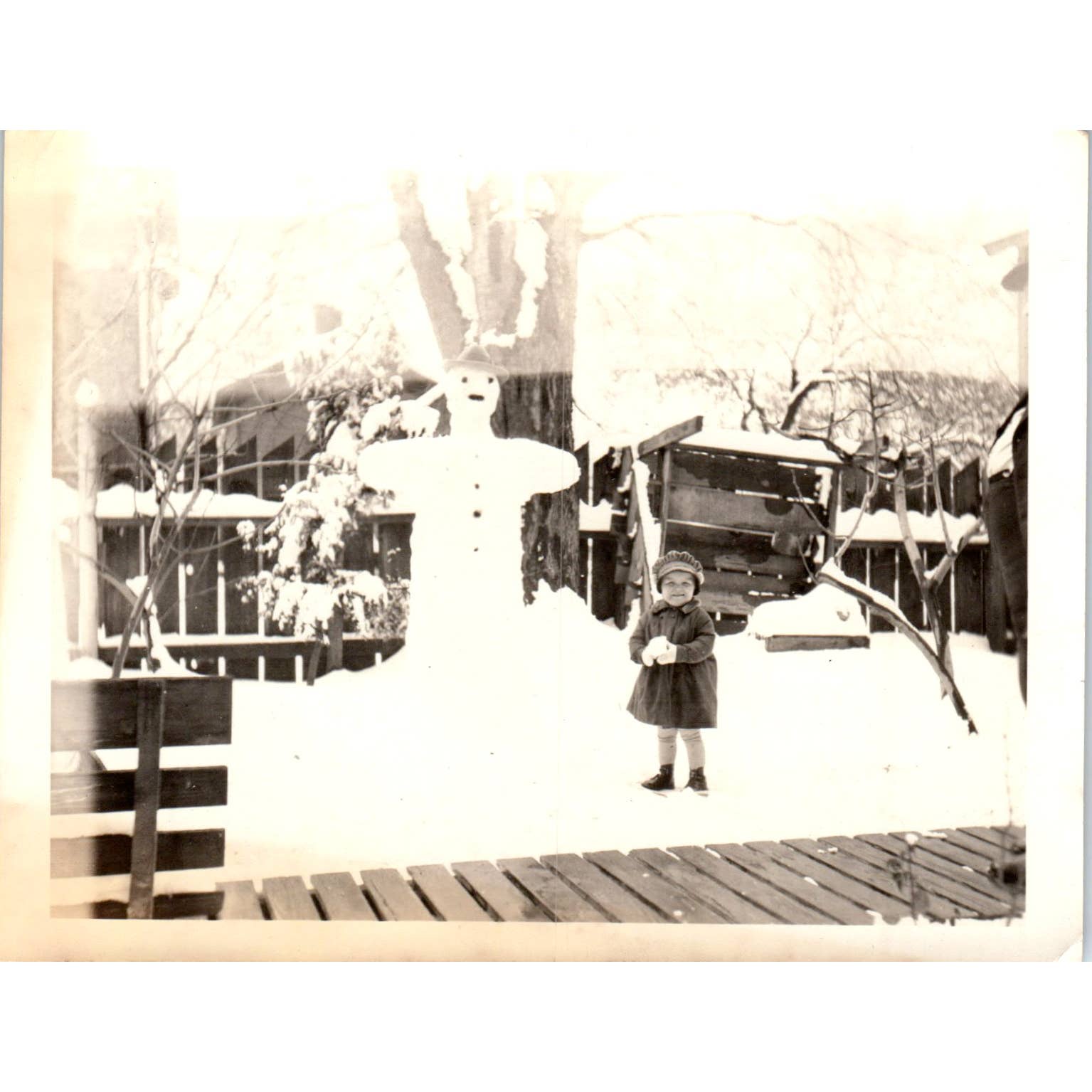 1940s Original Photograph Little Girl Posing Outside in Snow w/ Snowman 4x5 SE5