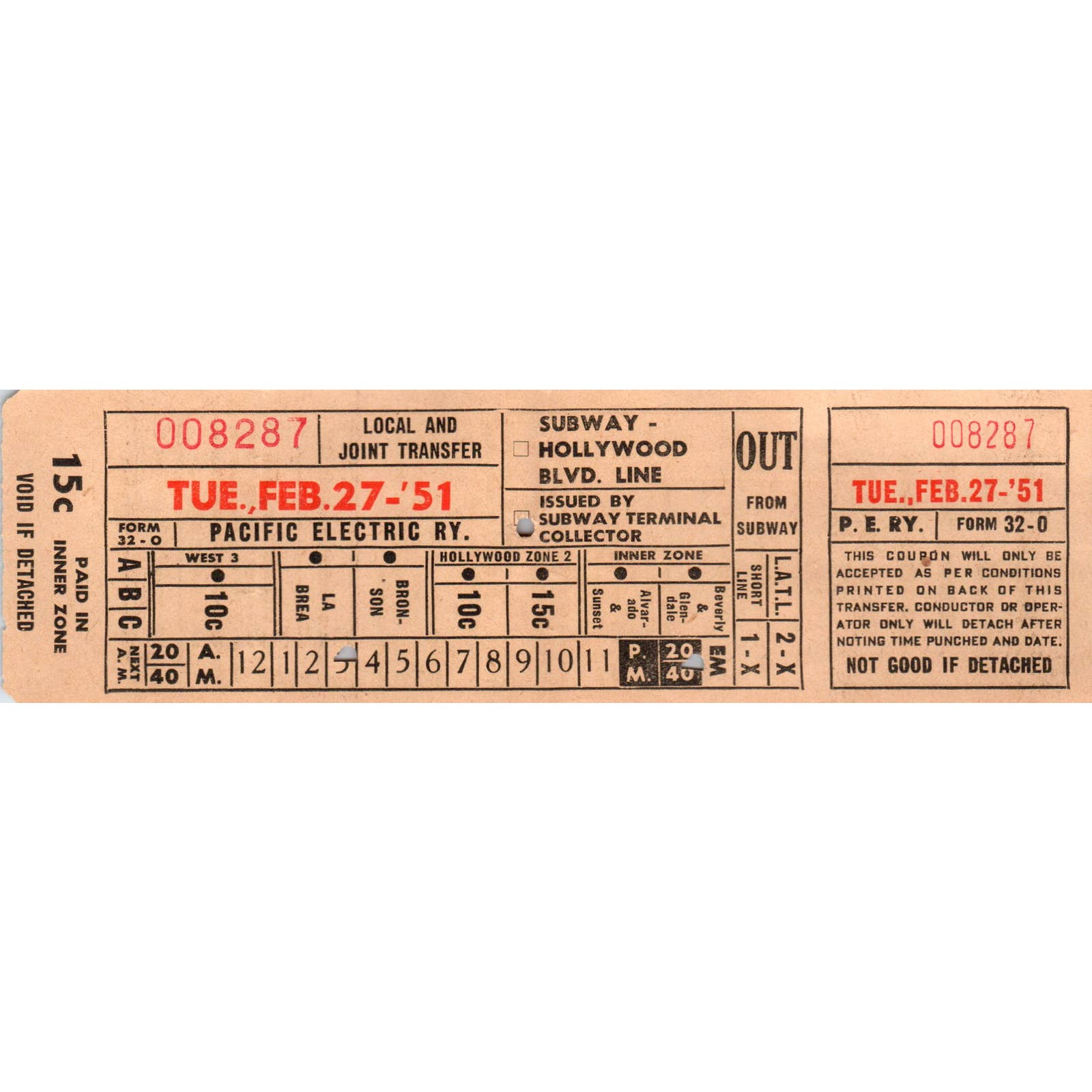 1951 Pacific Electric Railway Subway Hollywood Streetcar Transfer Ticket SE8