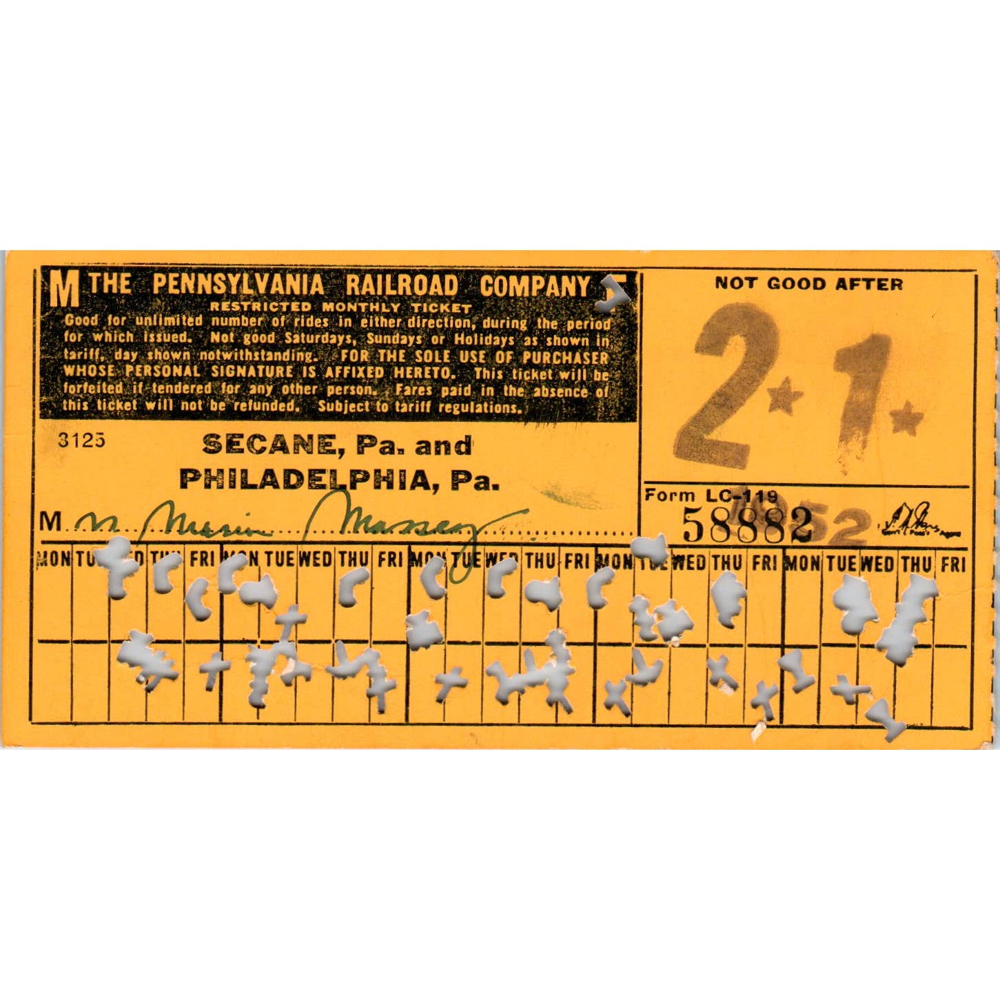 1952 Pennsylvania Railroad Company Restricted Monthly Ticket SE8