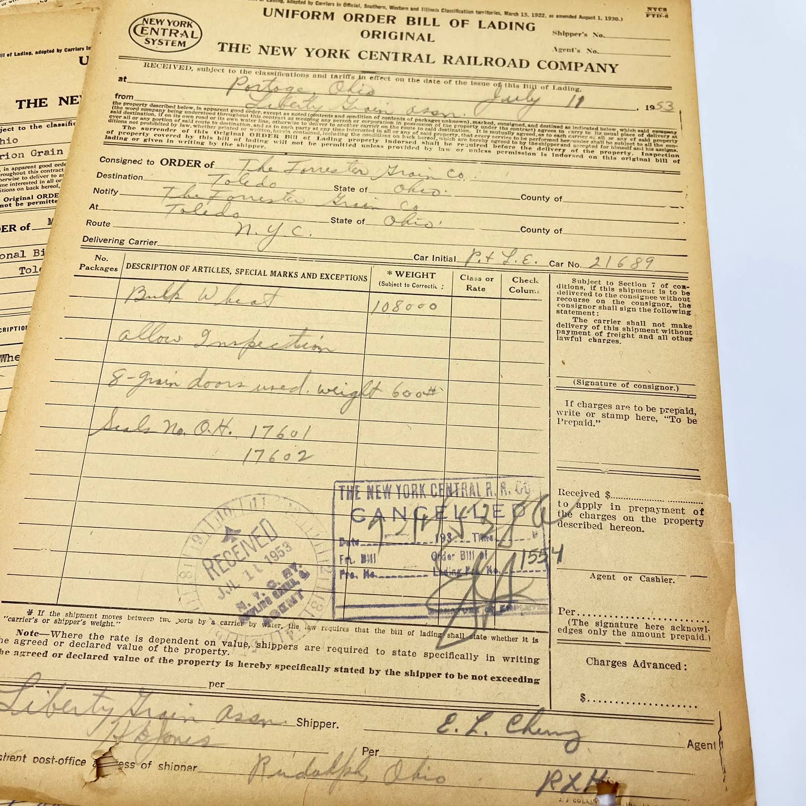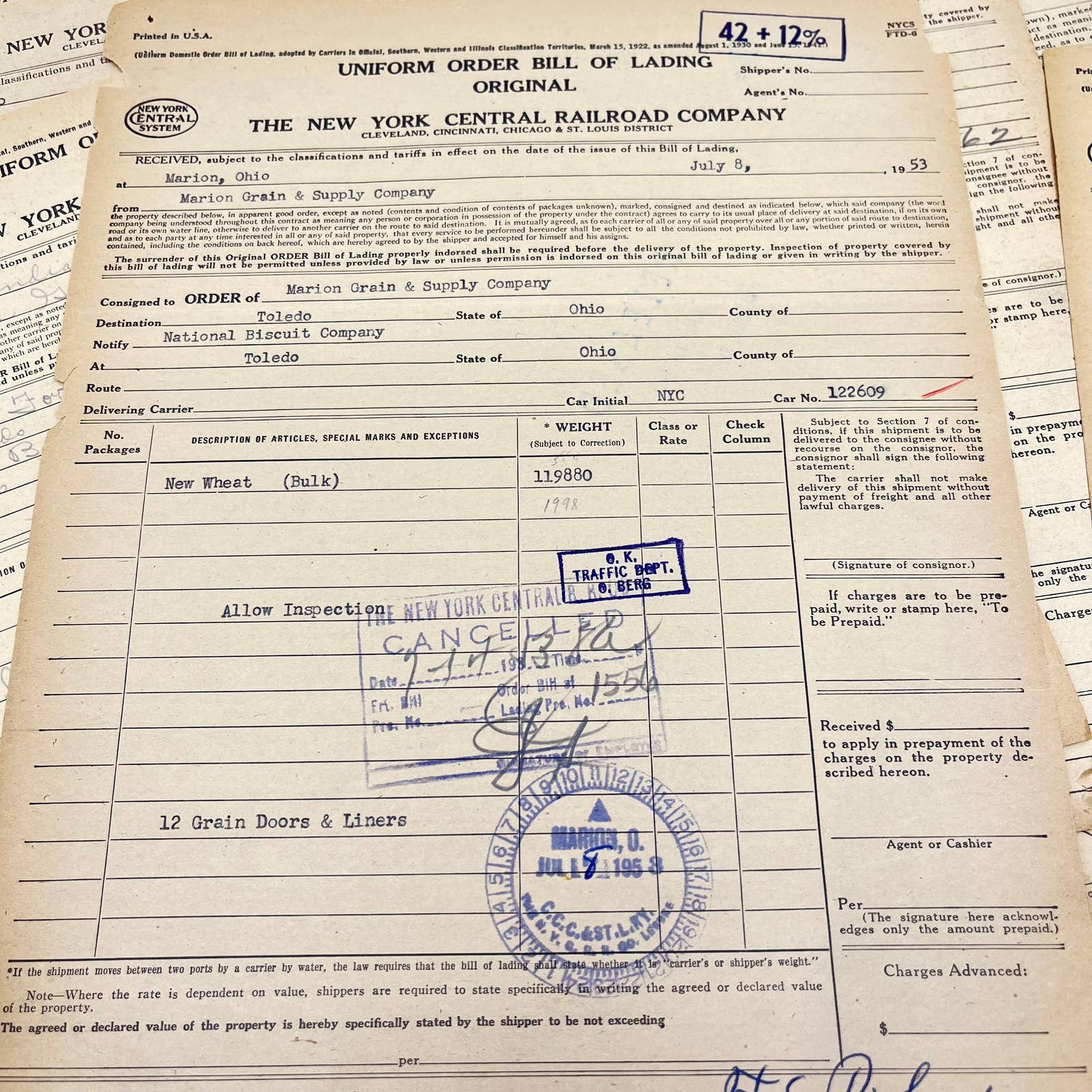 1953 The New York Central Railroad Co RR Original Bill of Lading Lot of 10 AB1-1